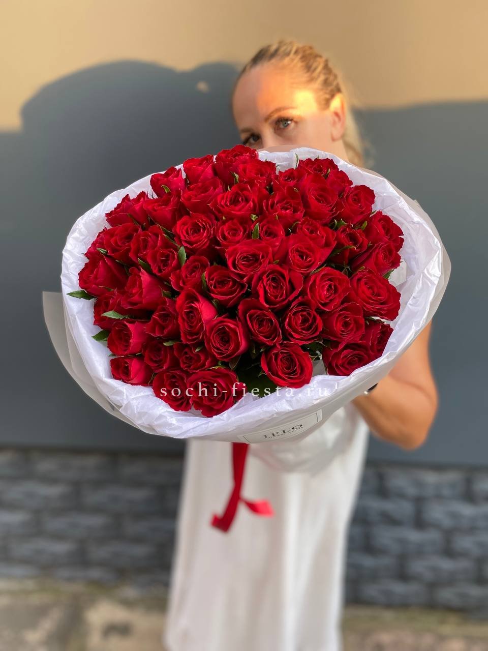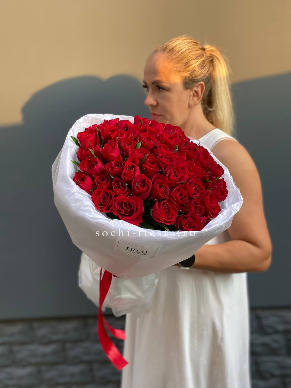 Пятьдесят одна роза насыщенного красного оттенка собрана в плотную композицию. Упаковка мягко обрамляет бутоны, сохраняя естественную форму и создавая цельный силуэт.