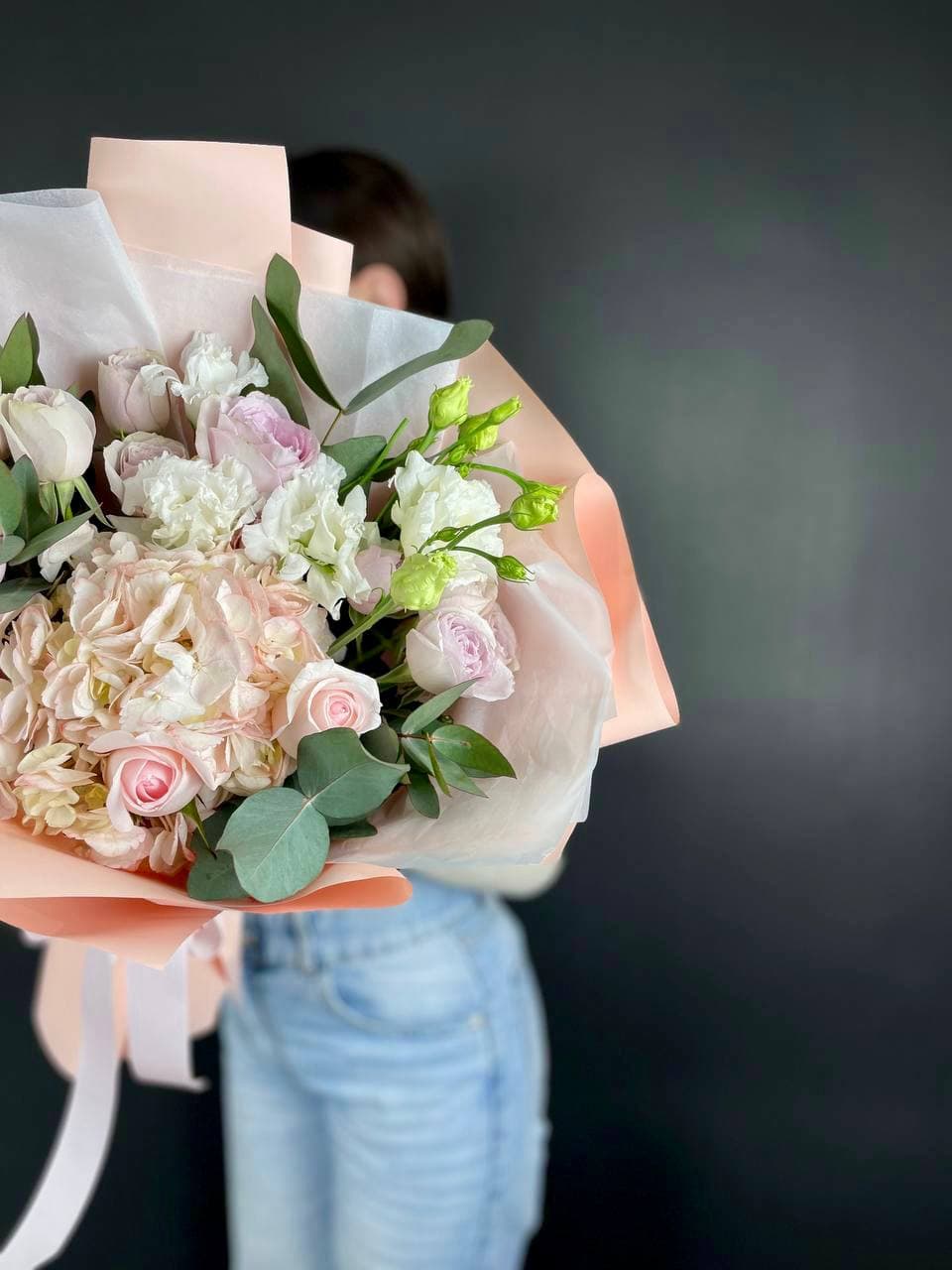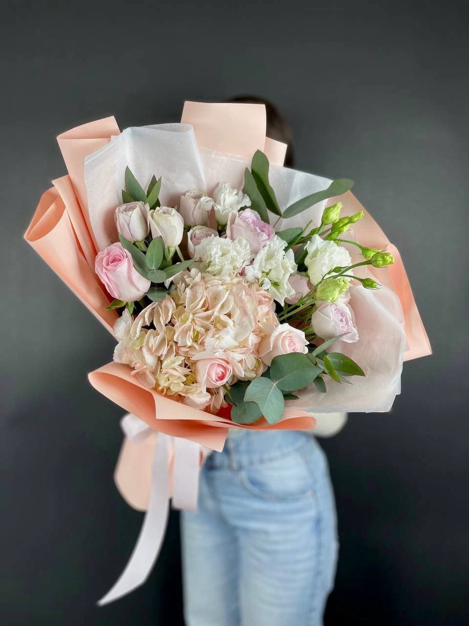 Французские розы распускаются мягкими облаками пудрового оттенка. Лимониум добавляет воздушности, а эвкалипт создает свежую основу. Букет собран так, что каждый бутон виден и дышит.