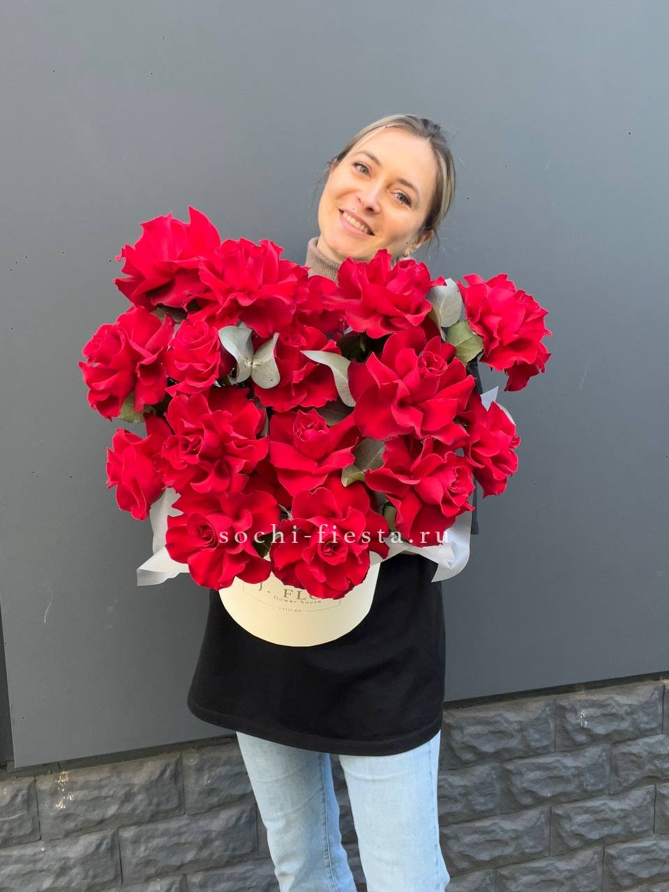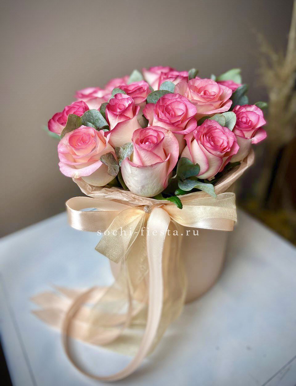вывернутые красные розы, цилиндр D16, эвкалипт, лента, упаковка.