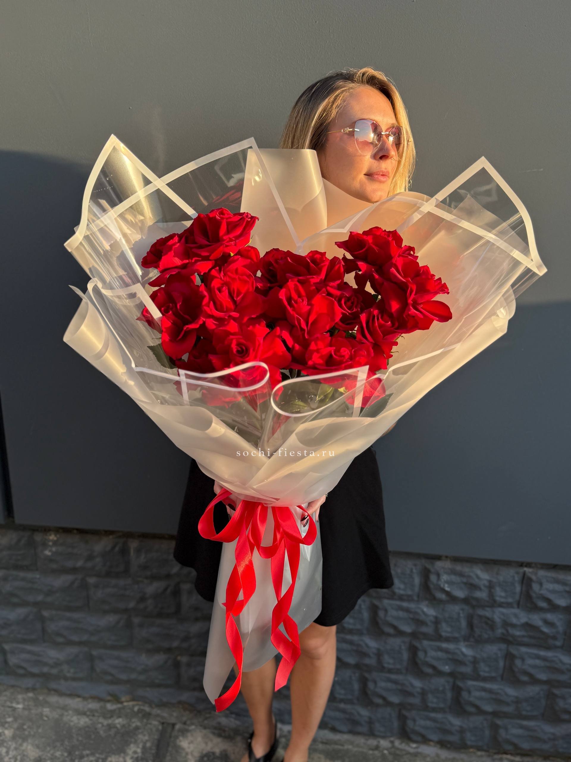 Пятьдесят пять бутонов собраны в плотную округлую форму, где каждый цветок читается отдельно. Красный здесь звучит насыщенно и глубоко, создавая мощное визуальное присутствие. Букет держит форму и занимает пространство уверенно.