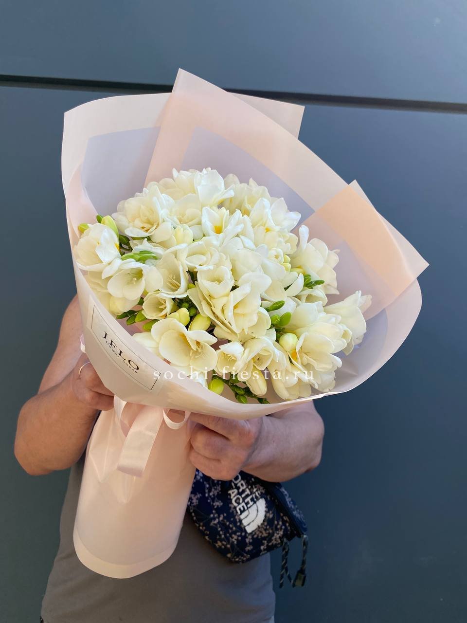 Состав: 25 белых фрезий, оформление, лента