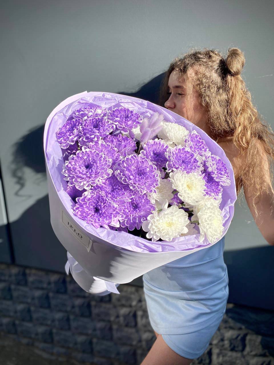 Пять веток кустовой хризантемы собраны в компактную форму с чёткими линиями. Лаконичная упаковка и лента сохраняют естественный объём соцветий. Букет выглядит собранно и свежо.