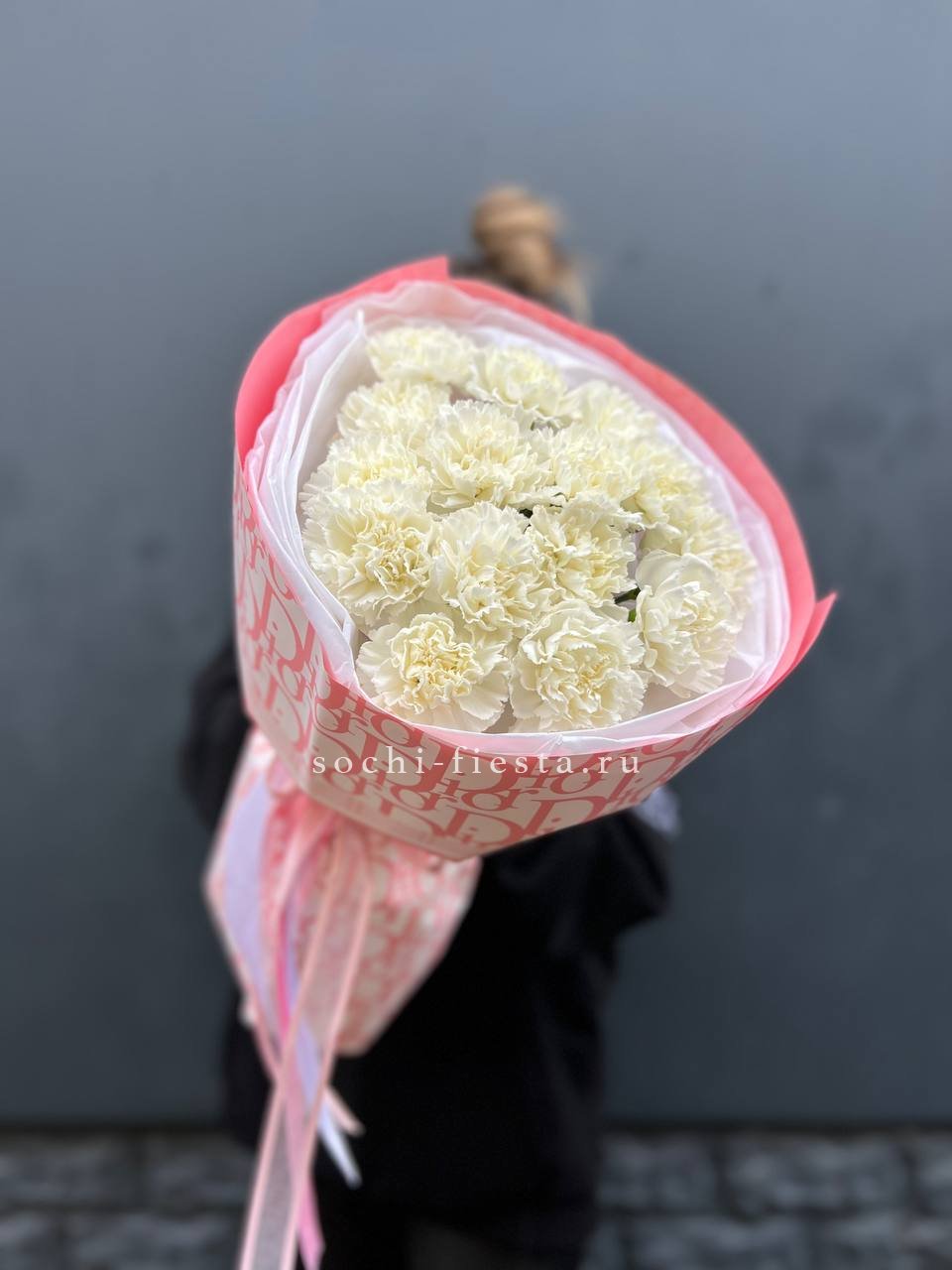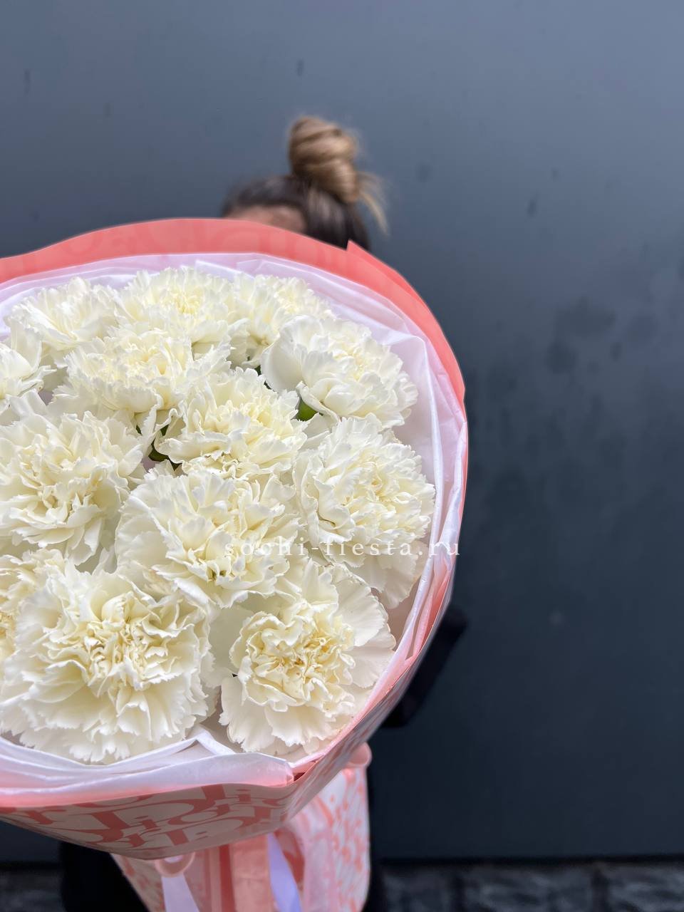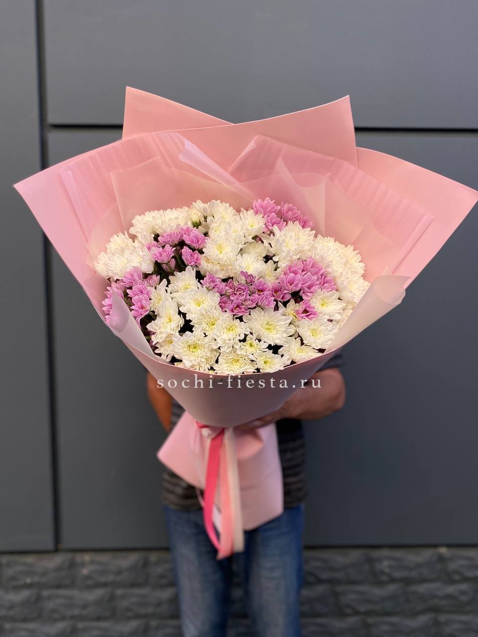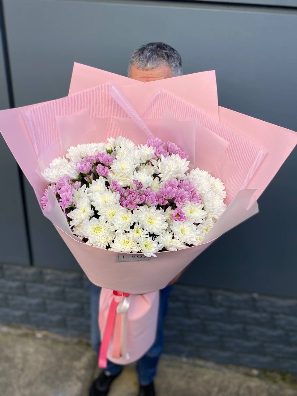 Белоснежные розы и герберы соседствуют с пушистыми шапками хризантем и воздушной статицей. Хлопок добавляет фактурный акцент, делая композицию объёмной и запоминающейся.