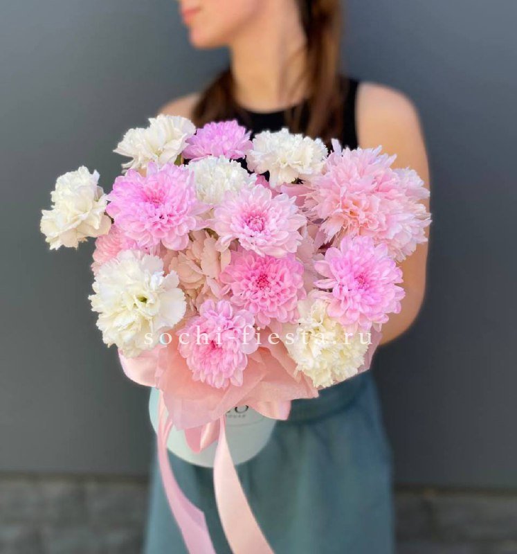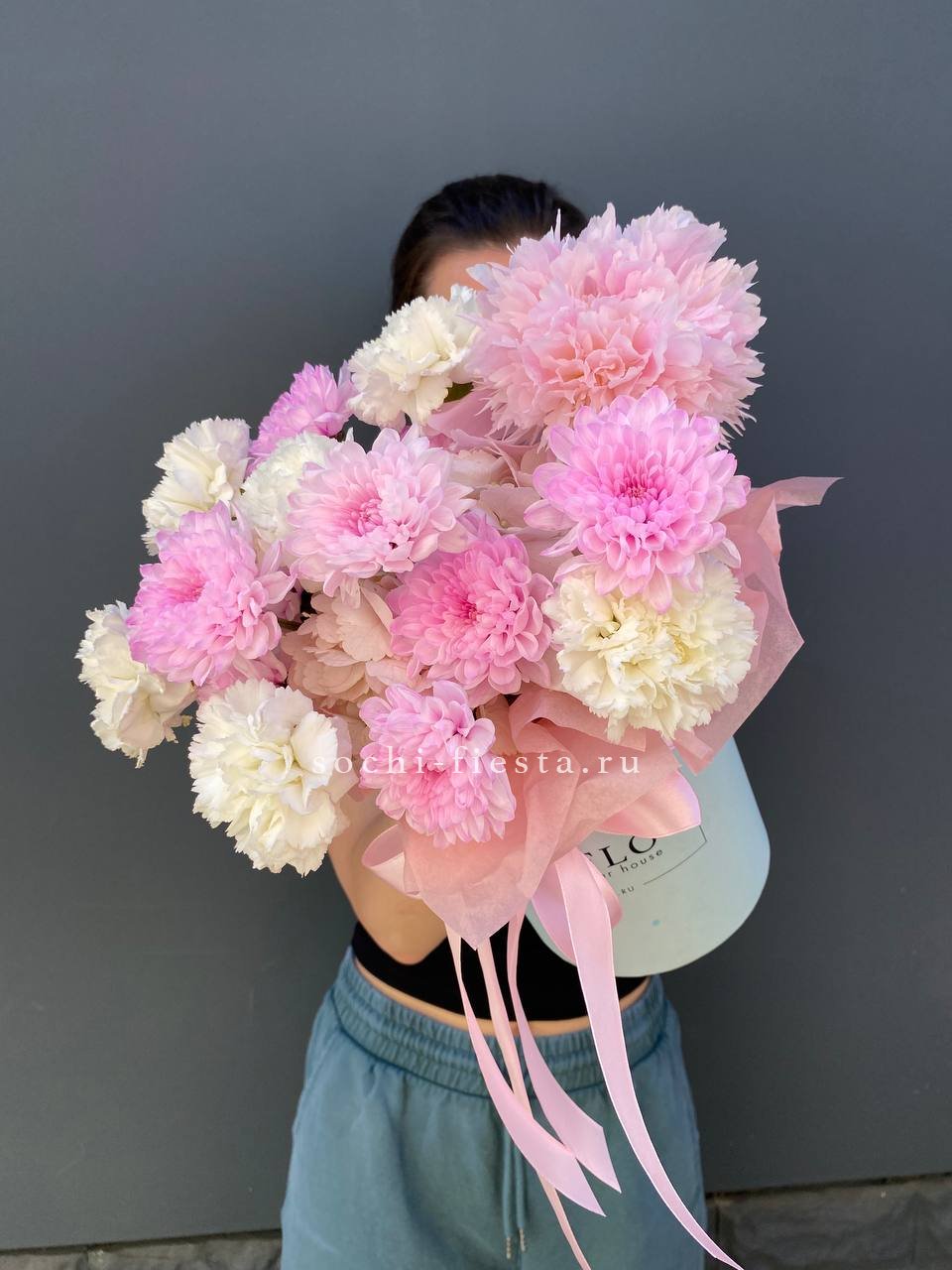 Воздушные кисти мисти бабблс переплетаются с яркими диантусами создавая объёмную текстуру. Эвкалипт добавляет свежести и завершает композицию лёгкими зелёными нотами.