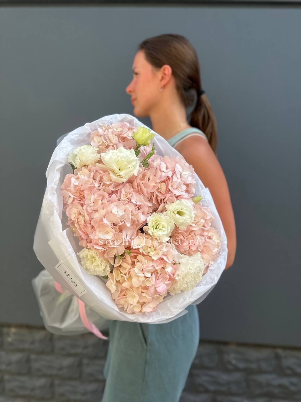 Розовая гортензия и эустома раскрывают свою красоту в каждом лепестке. Мягкие оттенки переходят один в другой, создавая спокойное и гармоничное впечатление.
