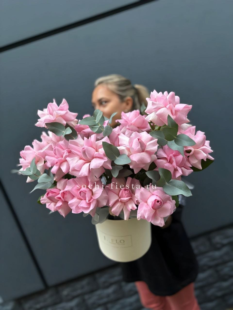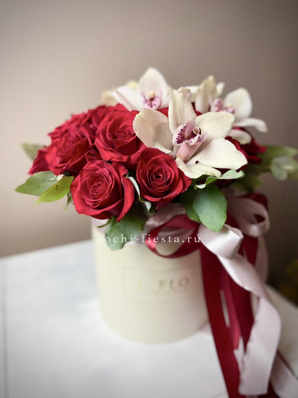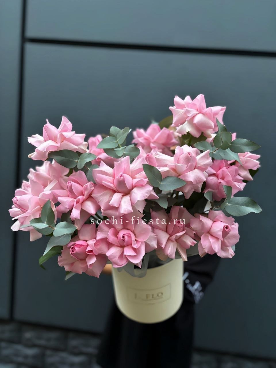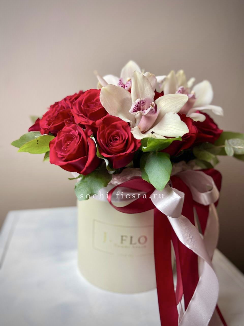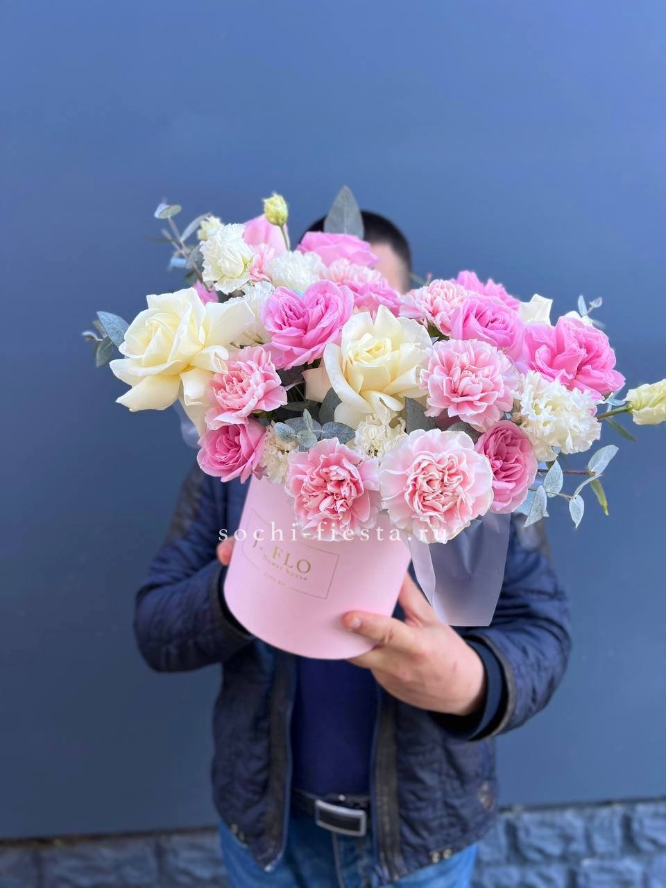 Белые и розовые розы переплетаются с эустомой и диантусом в круглом цилиндре. Эвкалипт добавляет объём и свежесть композиции. Сочная палитра для яркого поздравления.