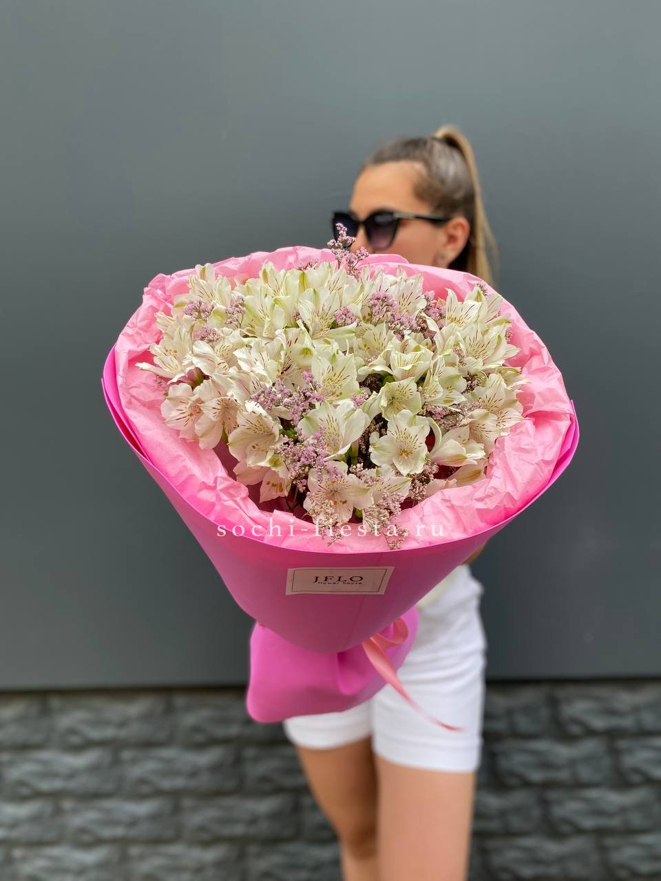 белые альстромерии - 11 шт., лимониум оформление.