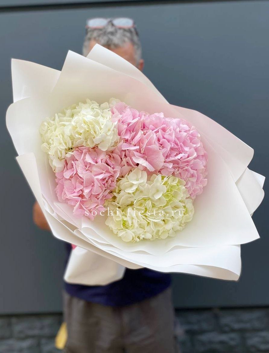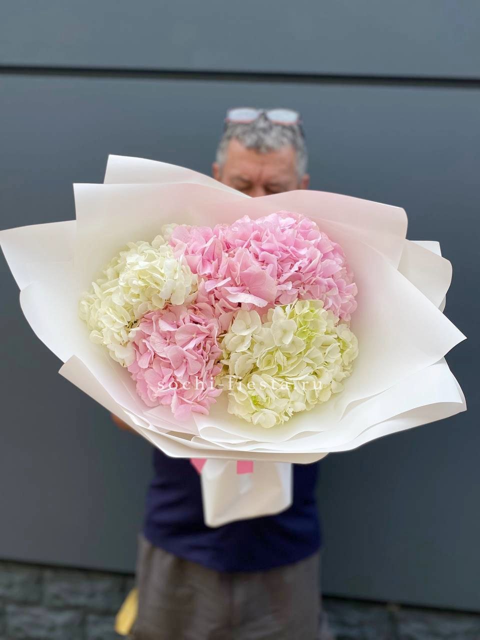 гортензия, лента, зелень по наличию, дизайнерская упаковка.