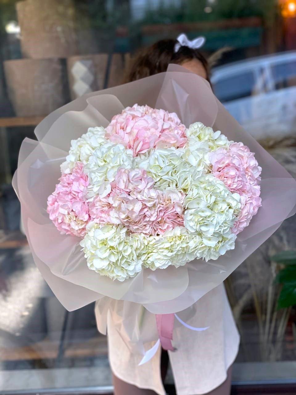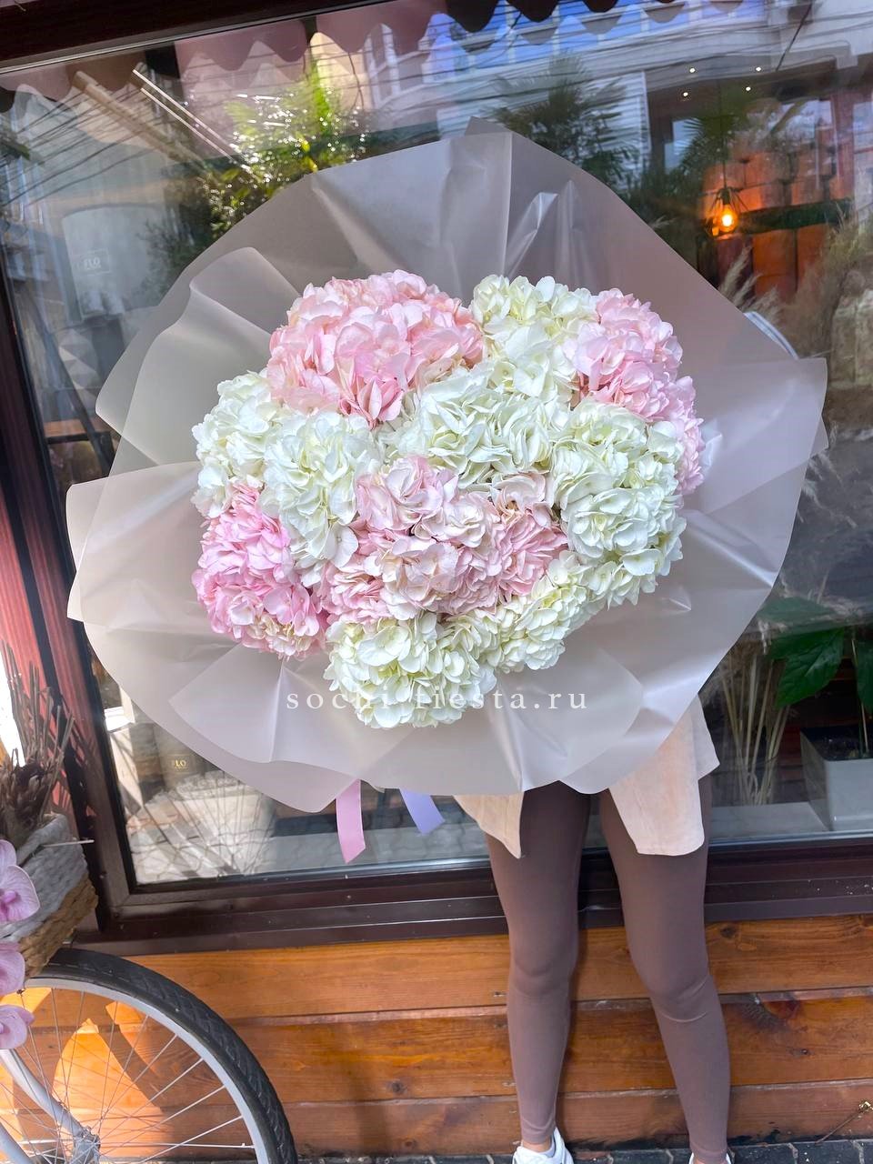 Воздушные шапки соцветий собраны в пышную охапку белоснежного цвета. Гортензия создаёт объёмную текстуру и заполняет пространство мягким природным светом. Букет для тех, кто ценит чистоту линий и естественную красоту.