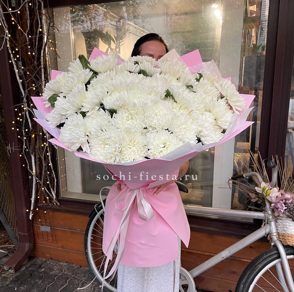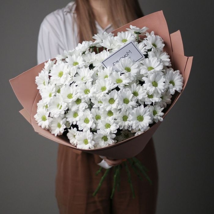 Fifteen веток кустовой хризантемы образуют пышное облако из множества мелких бутонов. Простая упаковка не отвлекает от густоты соцветий и их природной фактуры. Букет долго сохраняет свежесть и объём.