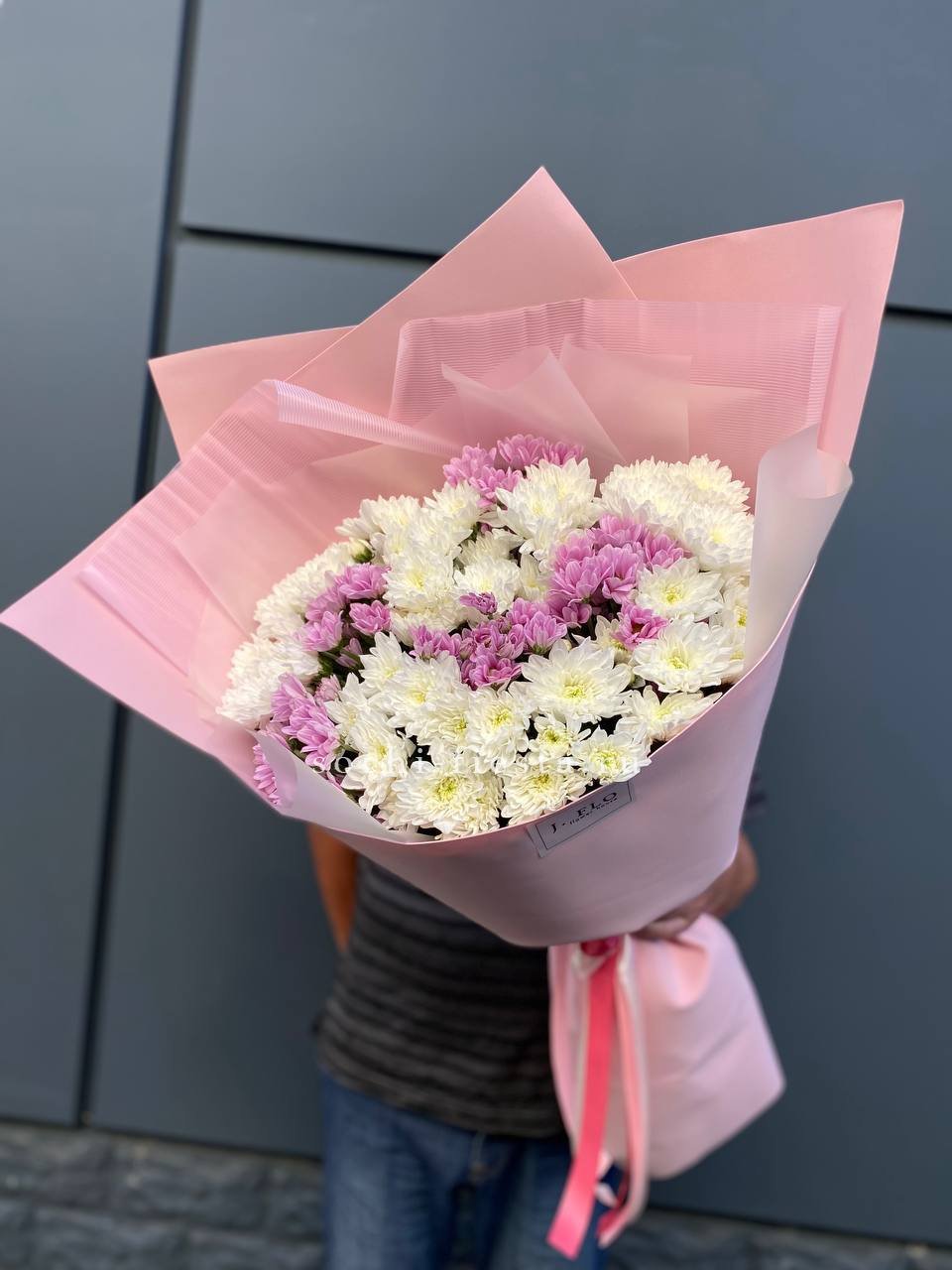 Пятнадцать веток кустовых хризантем с множеством бутонов создают пышную композицию с воздушной фактурой. Оформление из фоамирана добавляет букету завершенность и мягкий силуэт.