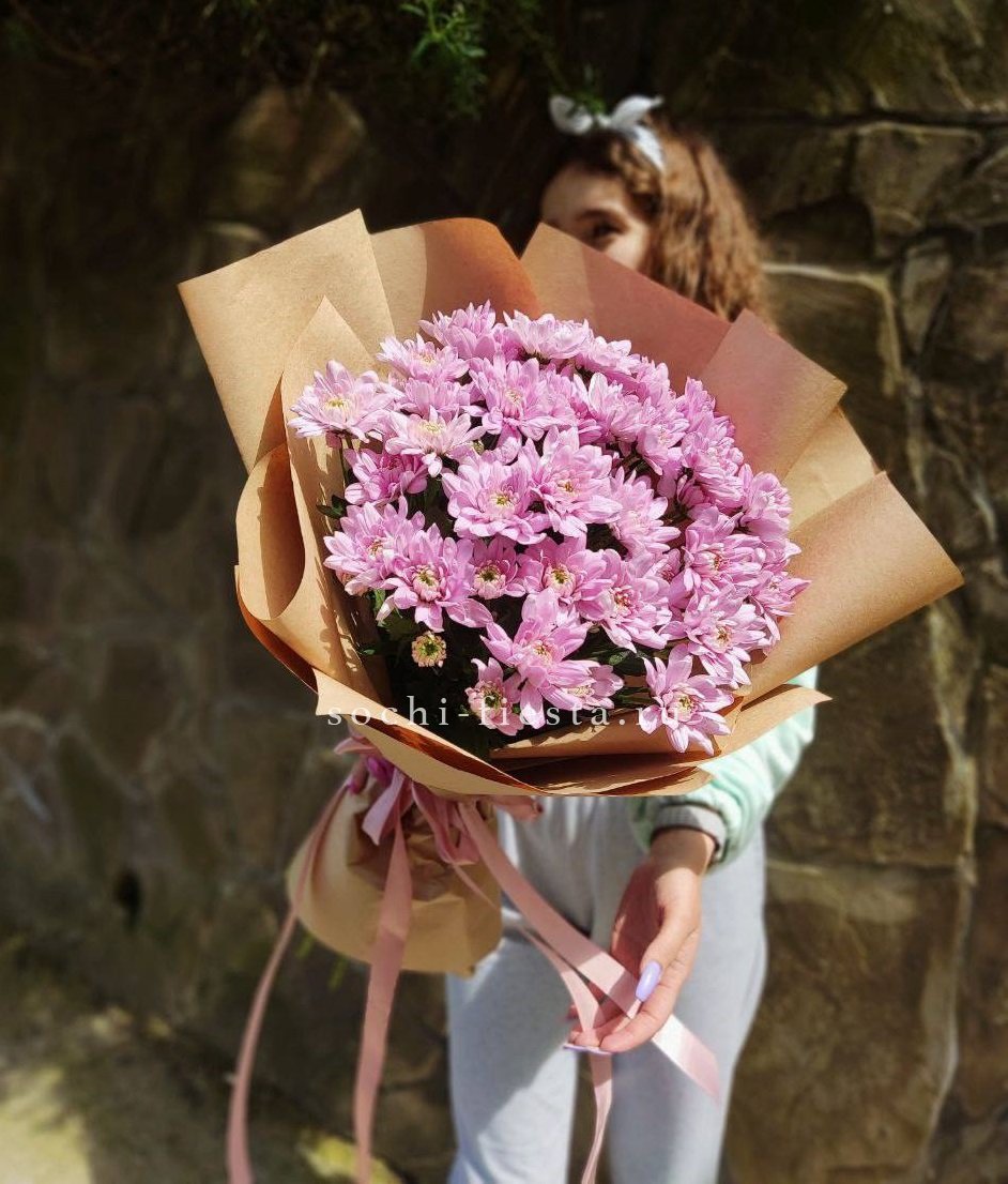 Пятнадцать веток кустовой хризантемы в натуральном крафте. Множество мелких соцветий формируют пышную шапку с естественной россыпью бутонов, подчёркнутую простотой оформления.
