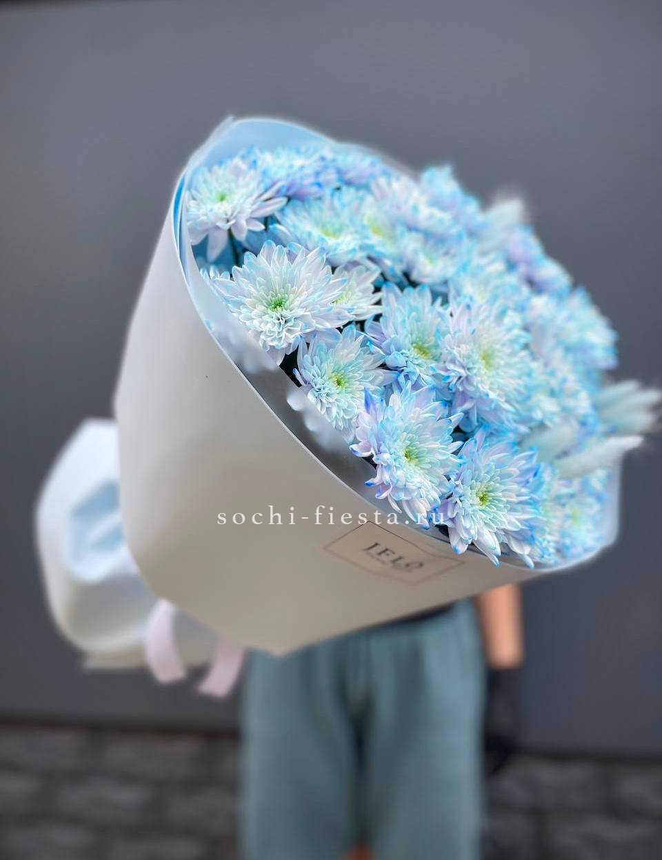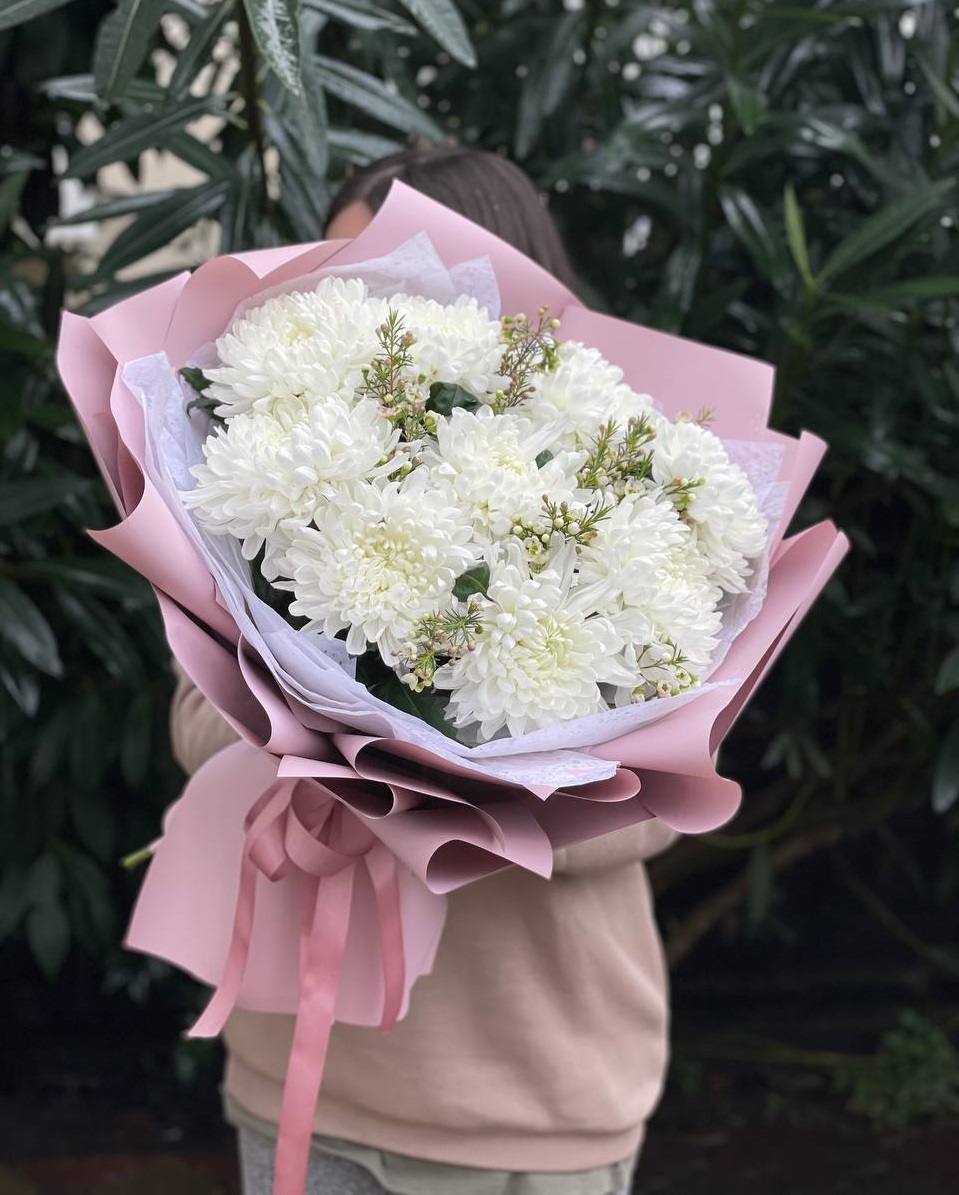 Сорок один бутон собран в плотное соцветие. Хризантемы формируют округлый силуэт с равномерным ритмом и чистой графикой. Монохромное решение с выразительной структурой.