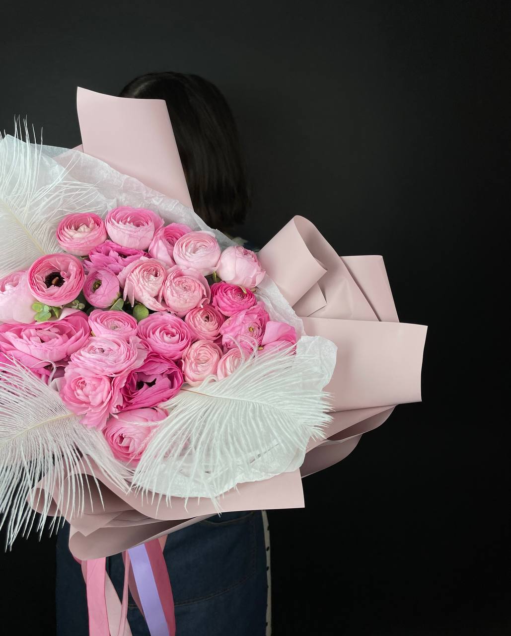 25 розовых ранункулюсов, 3 страусиных пера, лента, дизайнерская пленка или крафт.