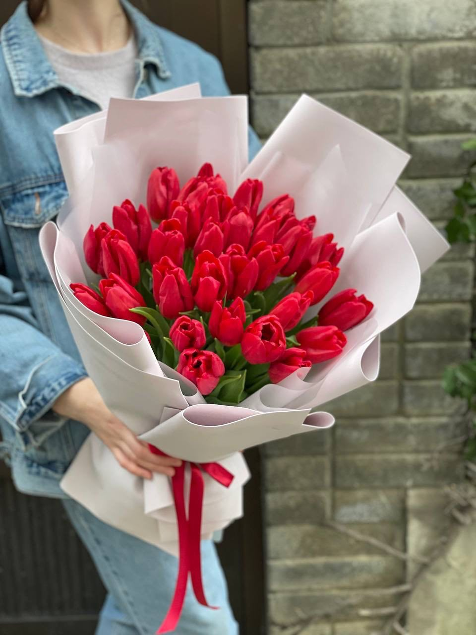 101 белый тюльпан, лента, крафт или дизайнерская пленка.