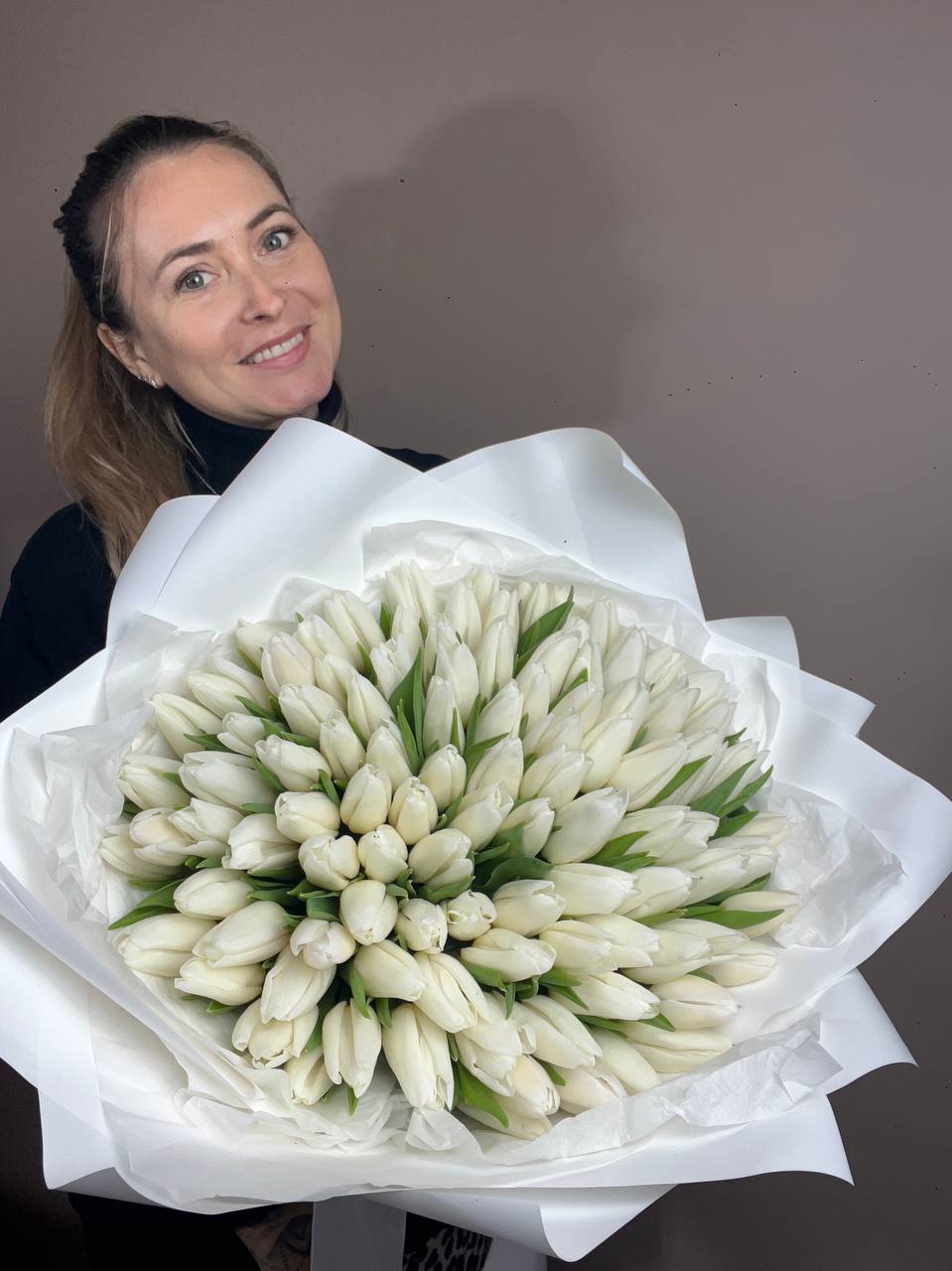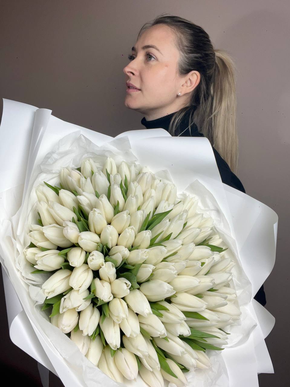 Девятнадцать тюльпанов с упругими закрытыми бутонами. Белые лепестки постепенно раскроются и покажут всю глубину цветка. Букет будет радовать свежестью несколько дней.
