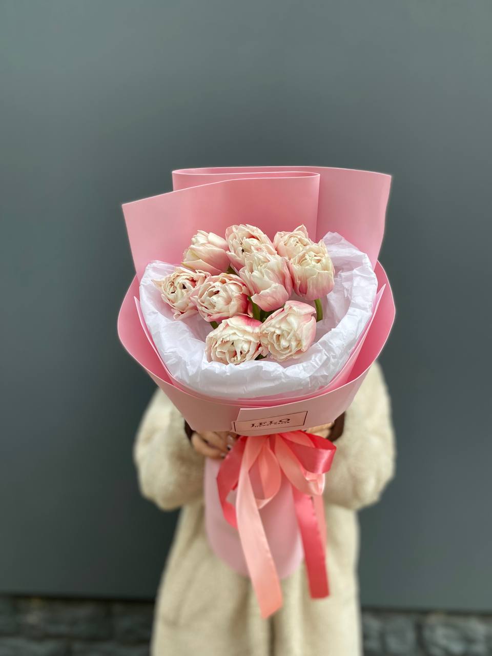 Девять тюльпанов в розовой гамме собраны в лаконичную композицию с мягким обрамлением. Бутоны держат форму и создают спокойный цветовой акцент в любом пространстве. Монобукет для тех, кто ценит простоту без лишних деталей.