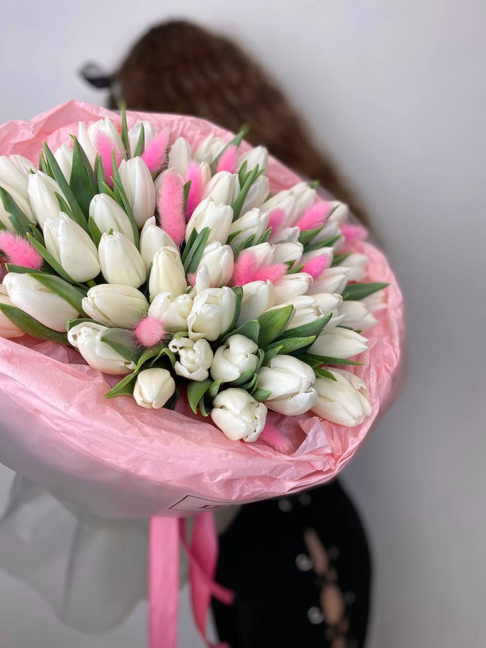 Плотная сборка из 39 белых бутонов с лёгкими нитями амаранта создаёт объёмную вертикальную форму. Белоснежные головки тюльпанов образуют упругий купол с чётким ритмом.