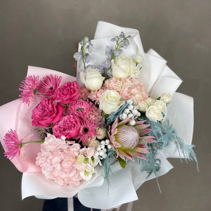 - Редкий состав — David Austin, ранункулюс, анемоны, сезонные пионы.