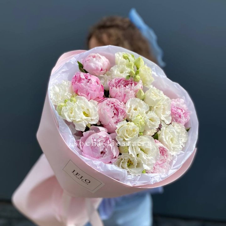 авторский сезонный букет из пионов с нигеллой и эвкалиптом в нежно-розовой нюдовой гамме для подарка в небольшом городе