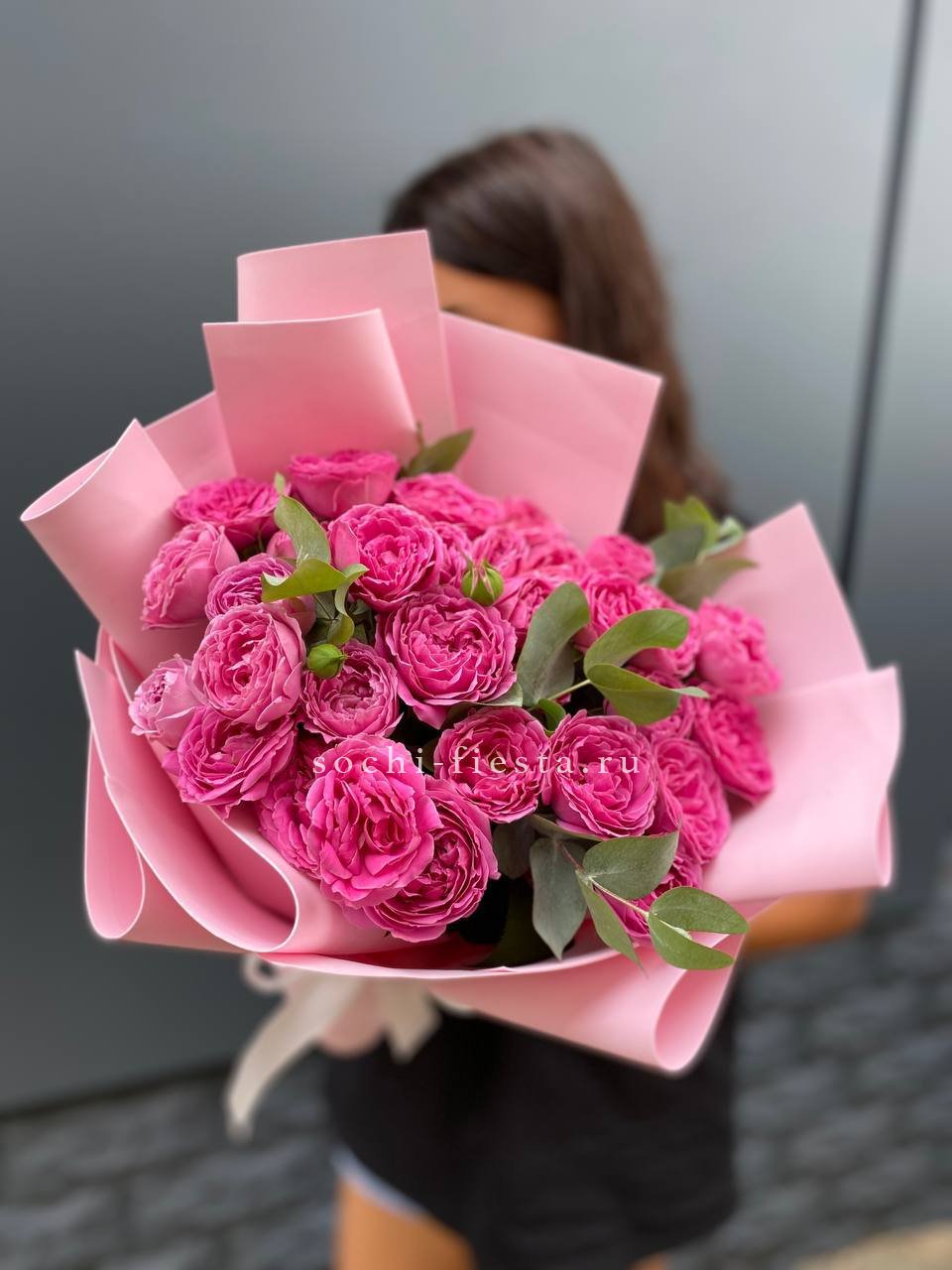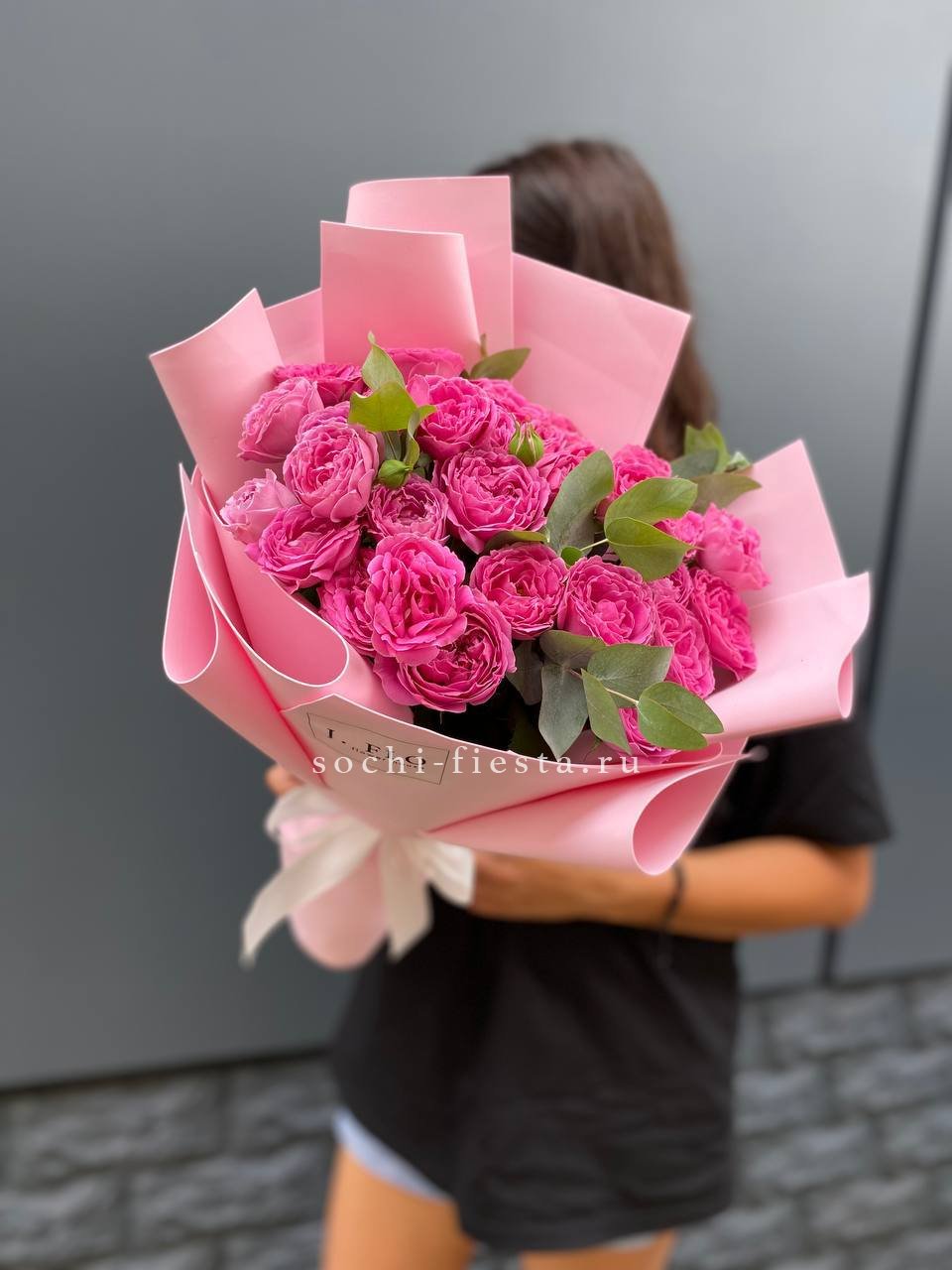 гортензия, роза пионовидная, гербер экзотический, роза одноголовая, пионовидная кустовая роза, хамелациум (или аналог), эвкалипт, дизайнерское оформление.