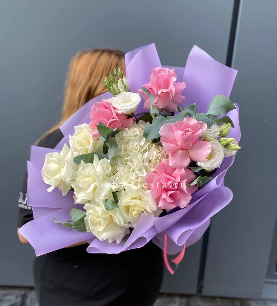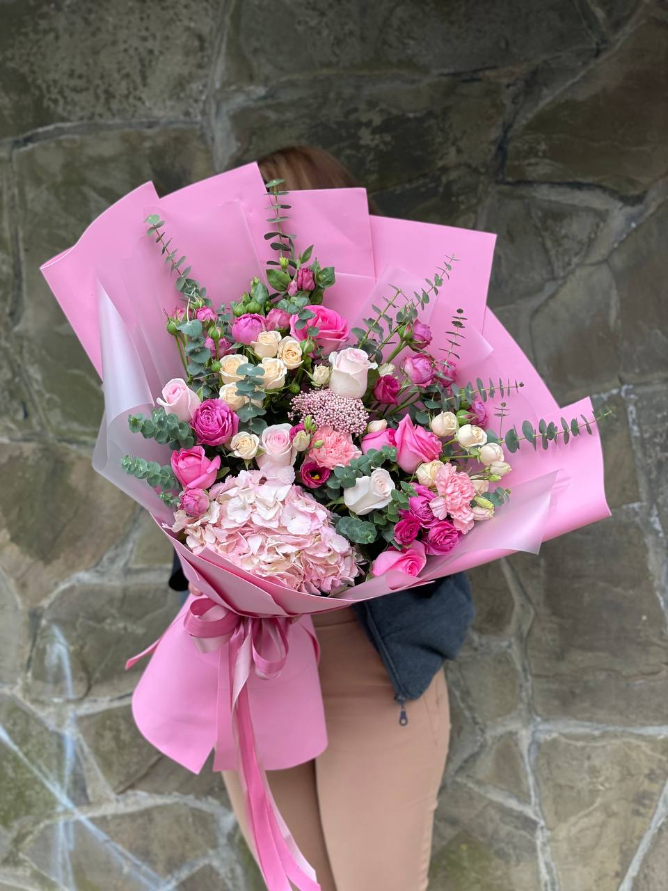 гортензия, роза одноголовая, роза кустовая Мисти Баблс, эустома, диантус, эвкалипт, лента, дизайнерская упаковка.
