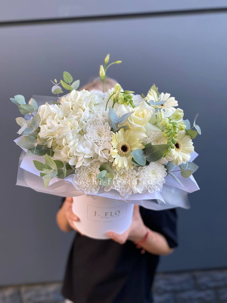 Композиция собрана из белых лилий и мелких соцветий в лавандовых и розовых тонах. Цилиндр объединяет цветы разной высоты и создает впечатление летнего букета в компактной форме.