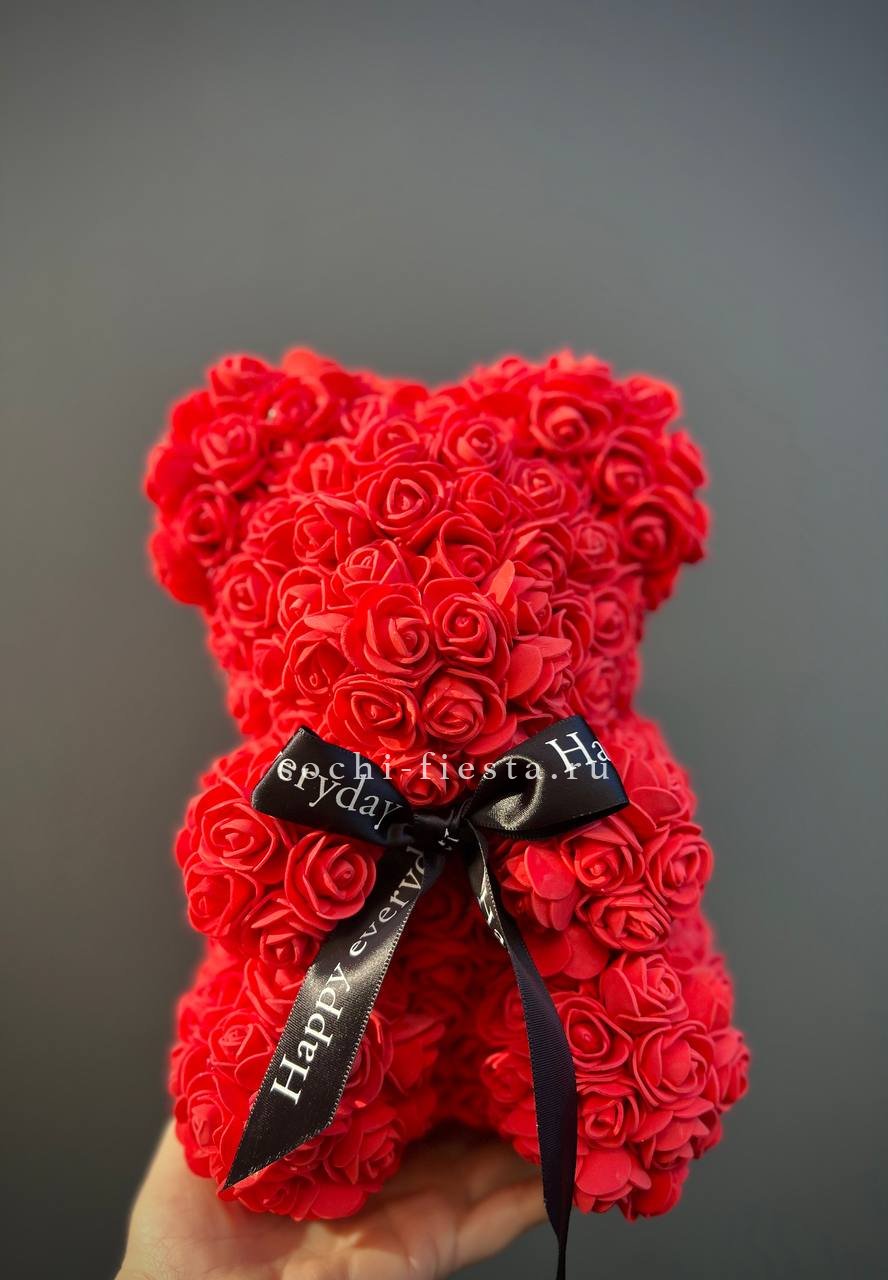 Фигурка медведя собрана из бутонов насыщенного алого оттенка. Каждый лепесток из фоамирана сохраняет форму и цвет без изменений. Компактная композиция для тех, кто ценит долговечность.