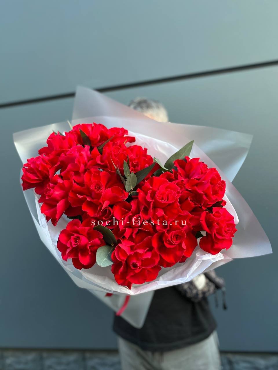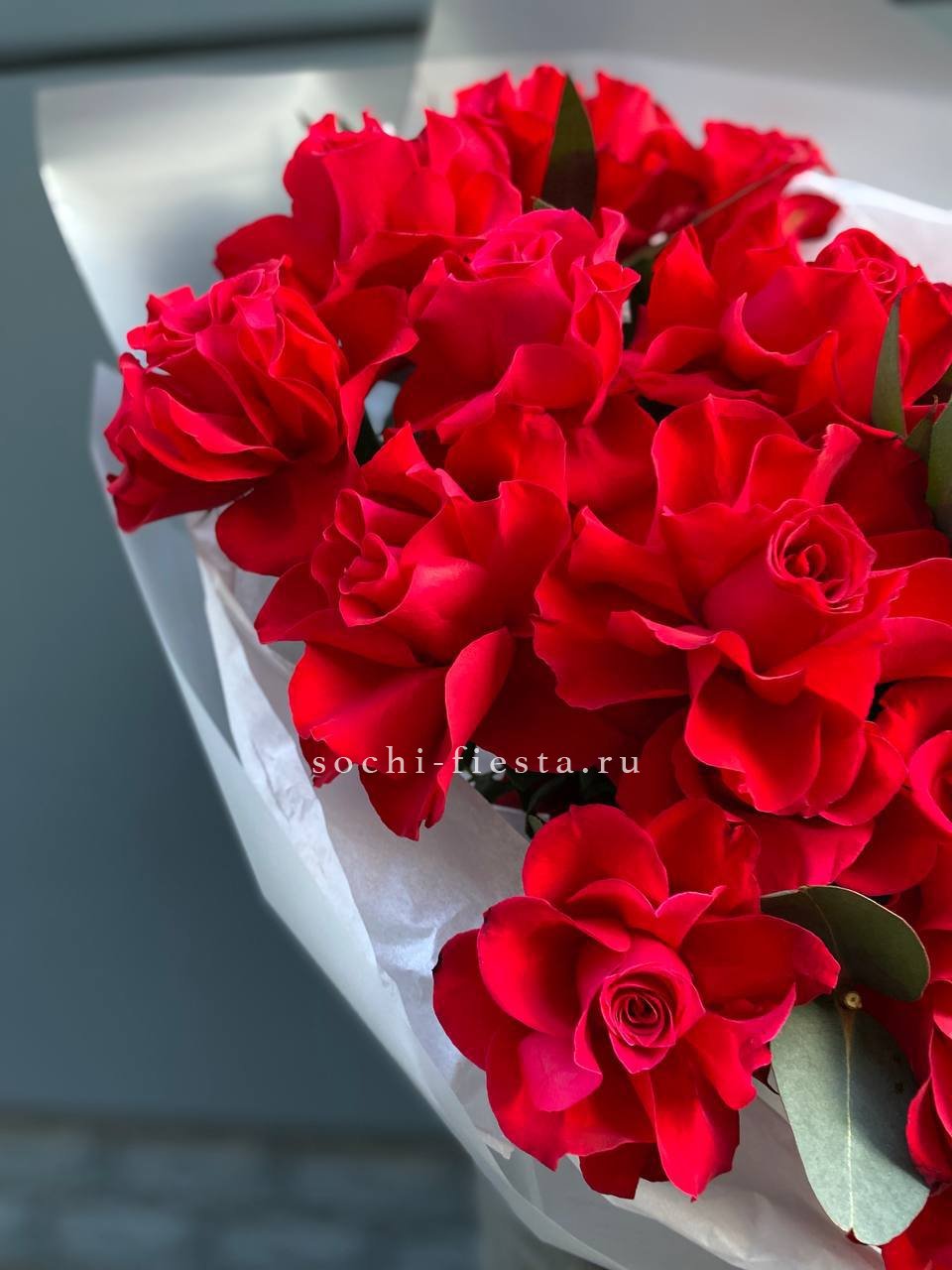 жёлтые тюльпаны, розы, эвкалипт, пленка.