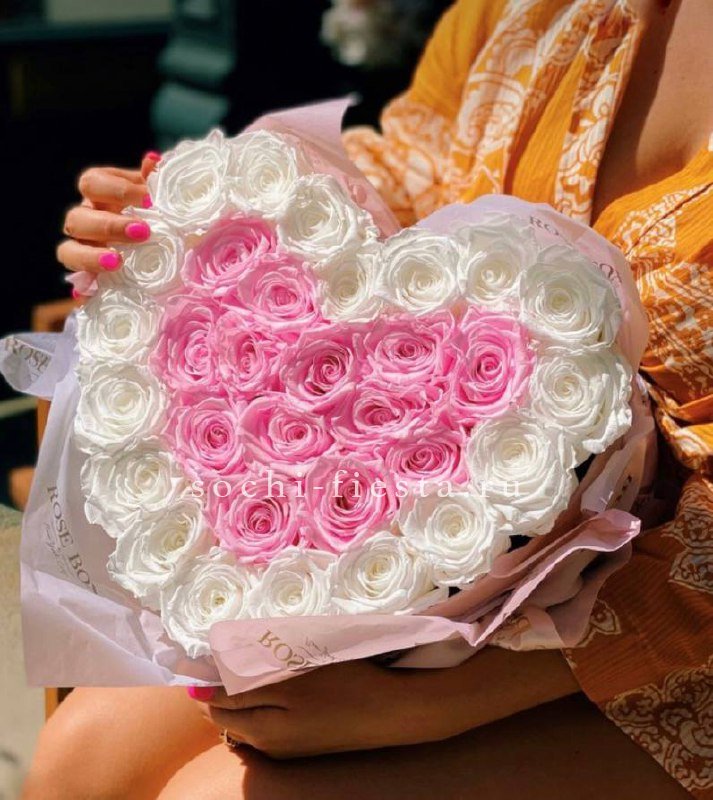 31 роза белого и розового оттенков, коробка в форме сердца (цвет может быть согласован), тишью.
