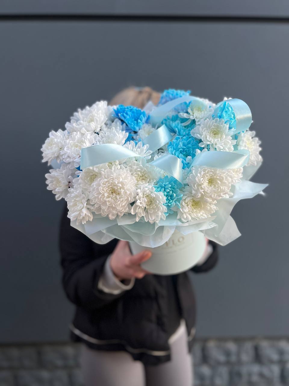 хризантемы в боксе с лентами.