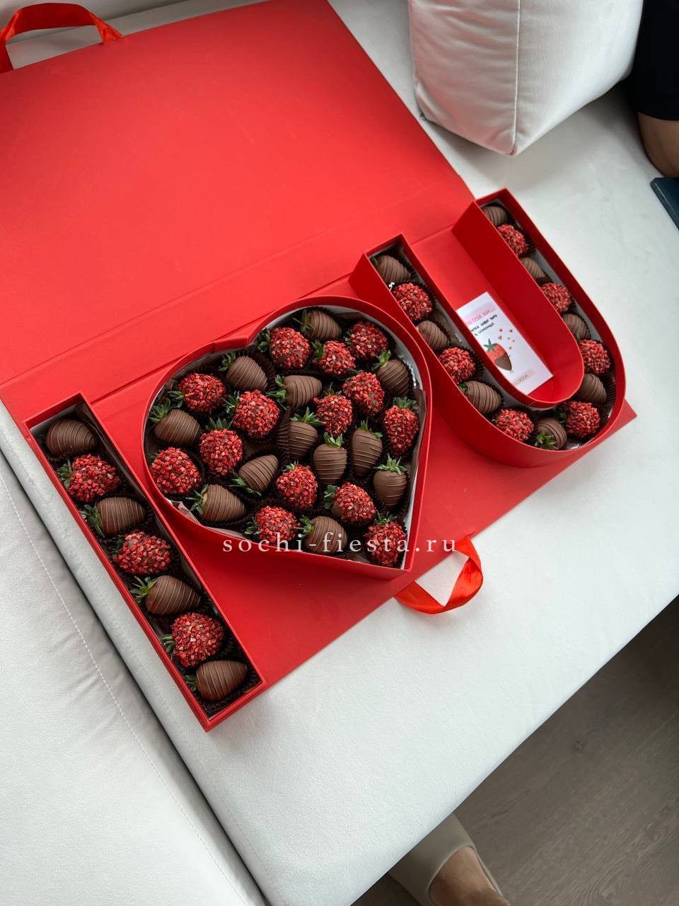 Спелая клубника в бельгийском шоколаде упакована в коробку-сердце. Сочная мякоть под блестящей глазурью превращает ягоду в романтичный десерт.
