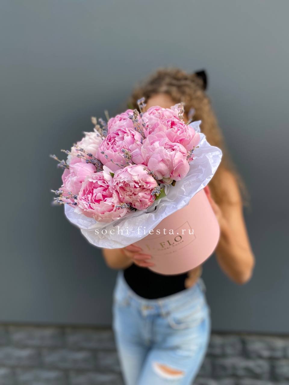 Девять пионов раскрываются над сиреневой дымкой лаванды. Цилиндр формирует вертикальную линию композиции. Фиолетовые оттенки переходят от насыщенных до припыленных.