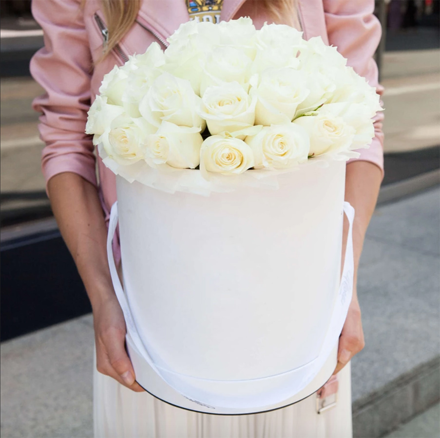Пионовидные розы раскрываются пышными шапками среди воздушной гортензии и эустомы. Композиция собрана в круглом боксе и держит форму без дополнительной упаковки.