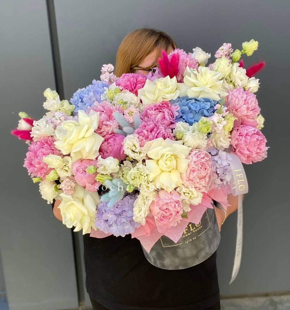 пионы, маттиола, эустома, белые розы, лента, гортензия, цилиндр D20.