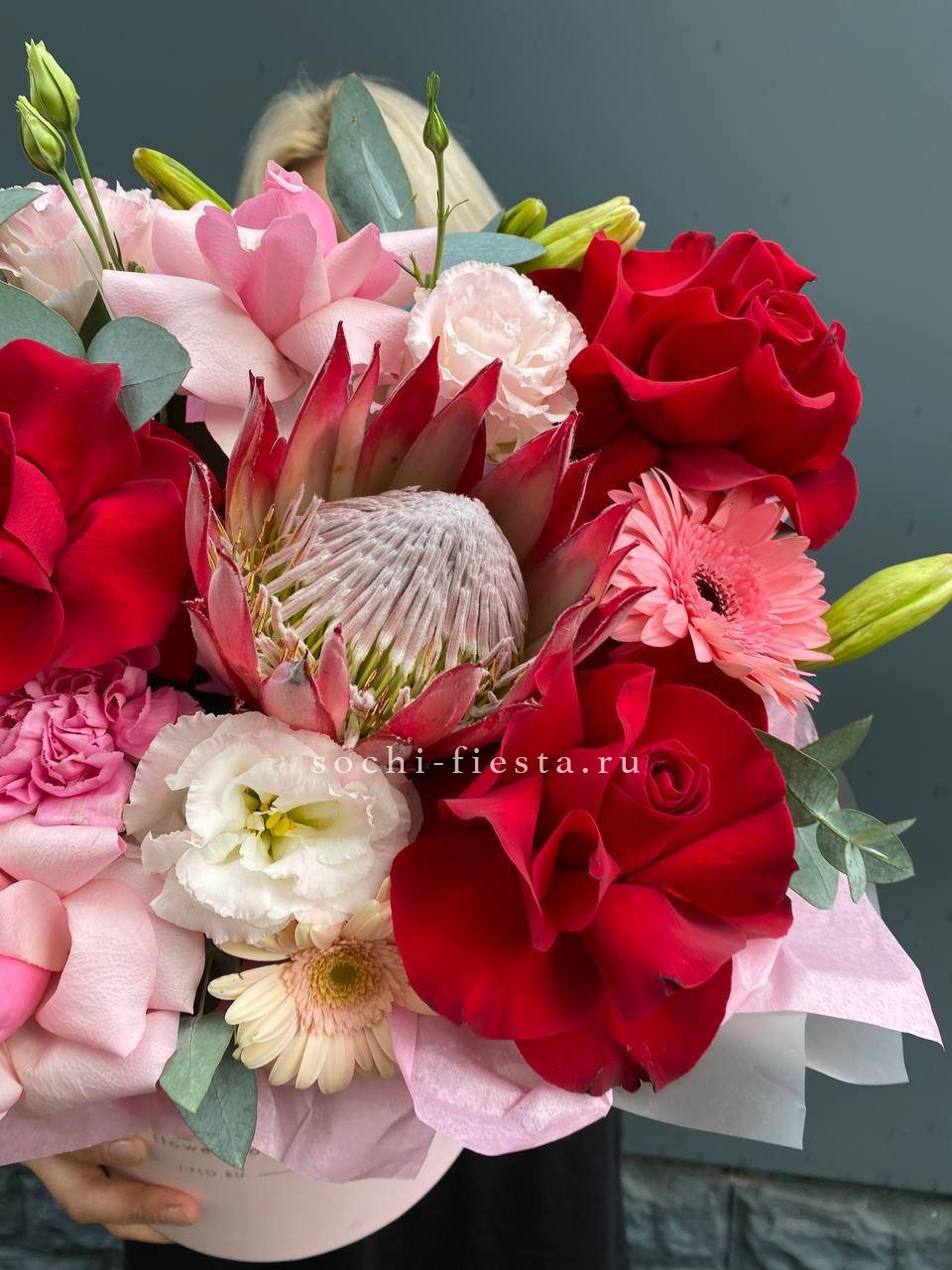 розы, протея, диантус, гербера, эустома, лилия, бокс 20.