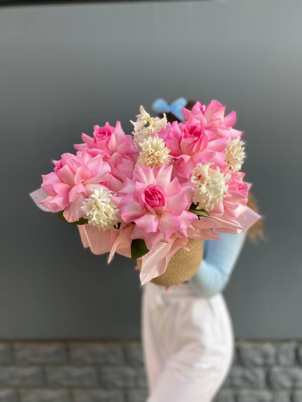розовые розы, пионовидные кустовые, эустома, ранункулюс (возможна замена в зависимости от сезонности) в джутовом кашпо с элементами бус и перьев.