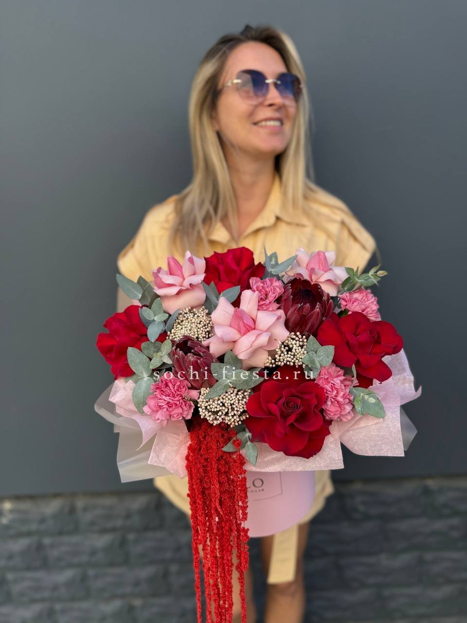Экзотичная протея задаёт тон всей композиции, где розовые и красные розы переплетаются с фактурным озатамусом. Диантус добавляет графичности, а эвкалипт смягчает линии.
