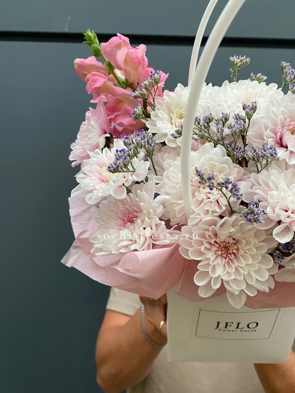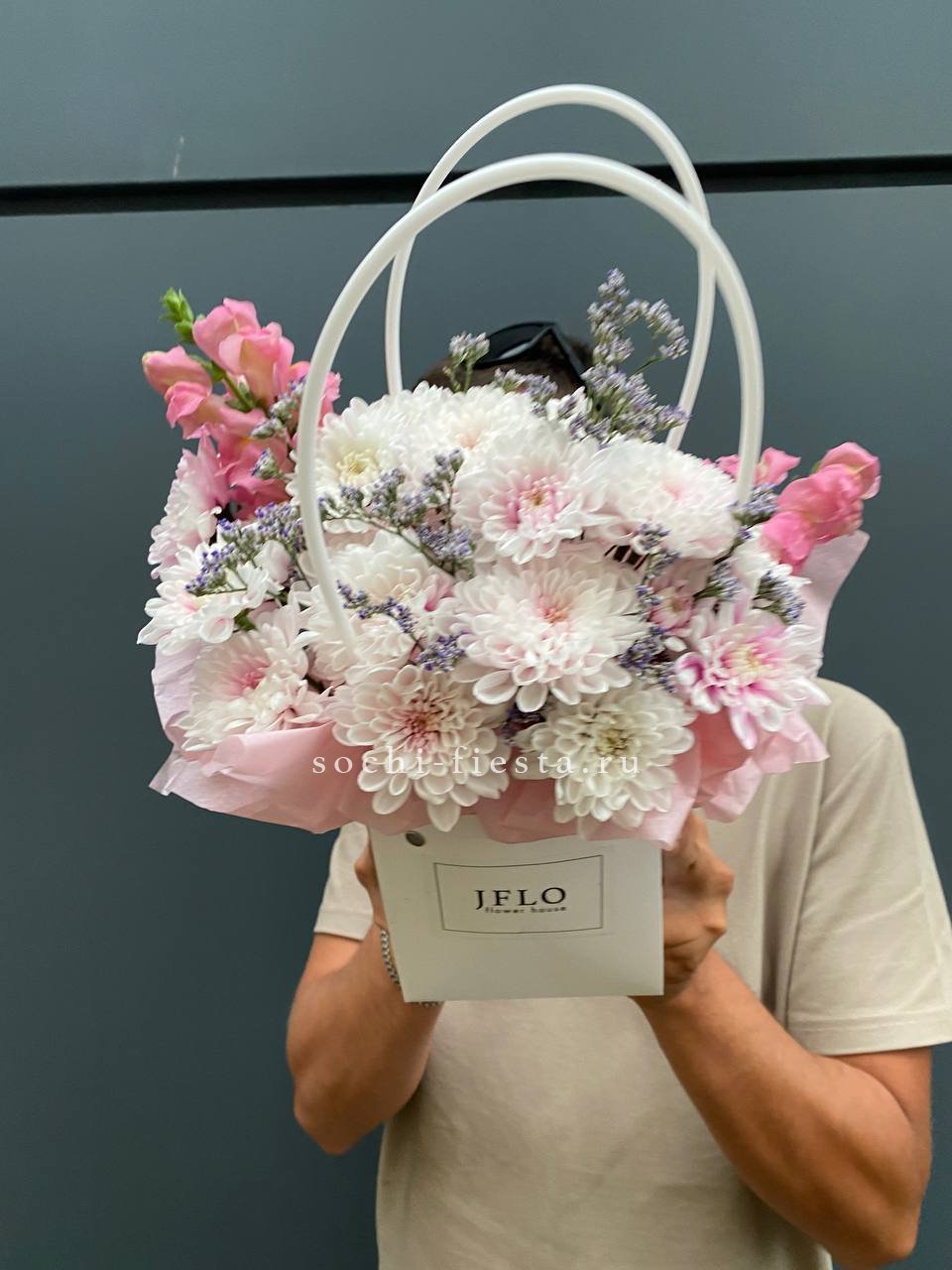 Гортензии задают плотную основу, герберы и диантусы вносят ритм, а альстромерии с эустомой создают движение вверх. Разнообразие форм и оттенков выстраивает многослойную картину в одной сумке.