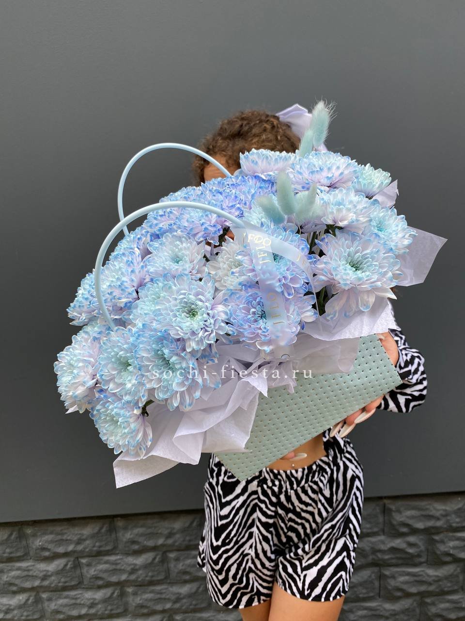 Голубая хризантема в компании воздушного лагуруса напоминает о прохладе летнего утра. Компактная форма в сумочке позволяет разместить цветы на столе или полке без лишних усилий.