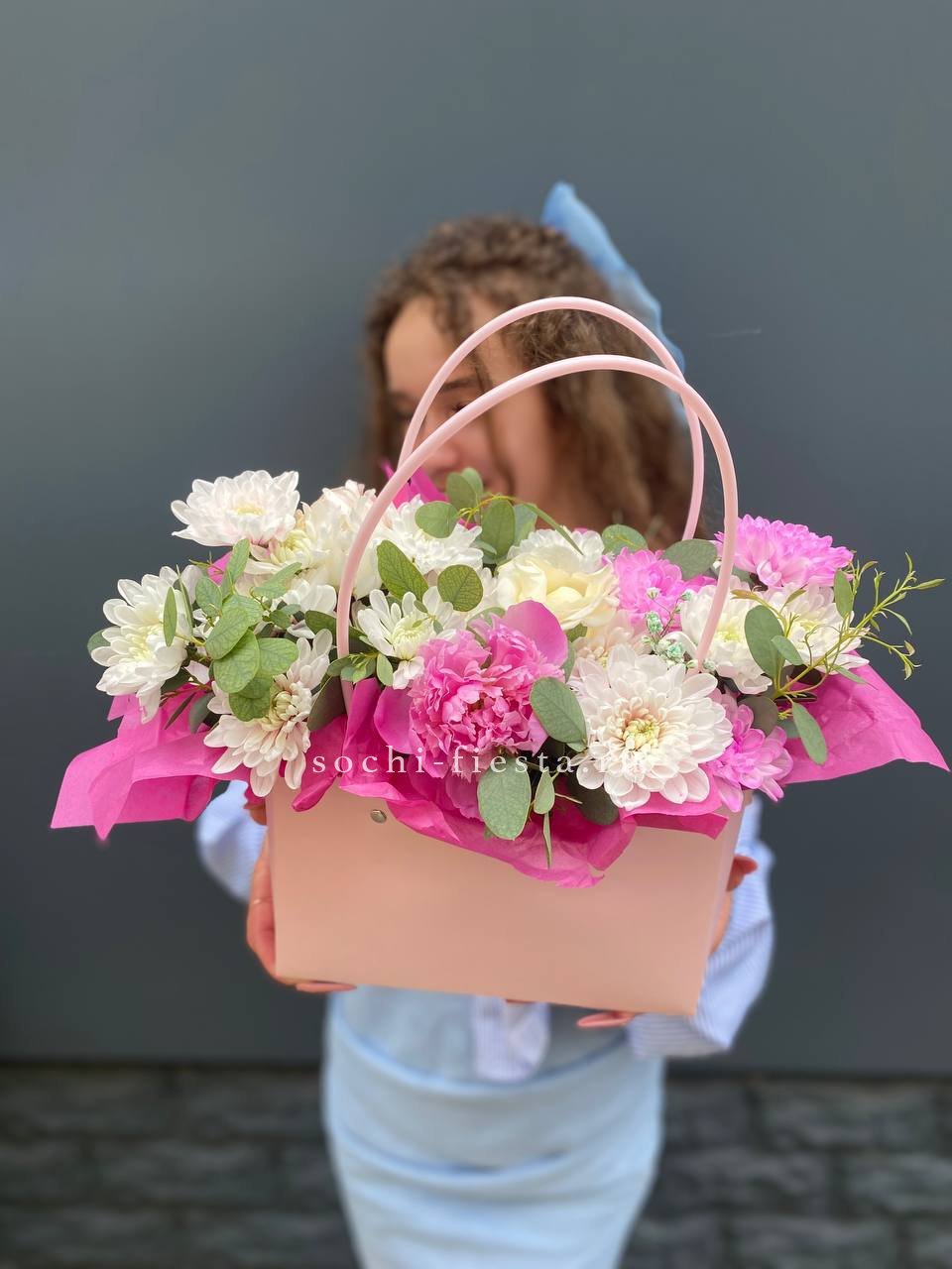 хризантемы, пионы, лента, сумка-кашпо.