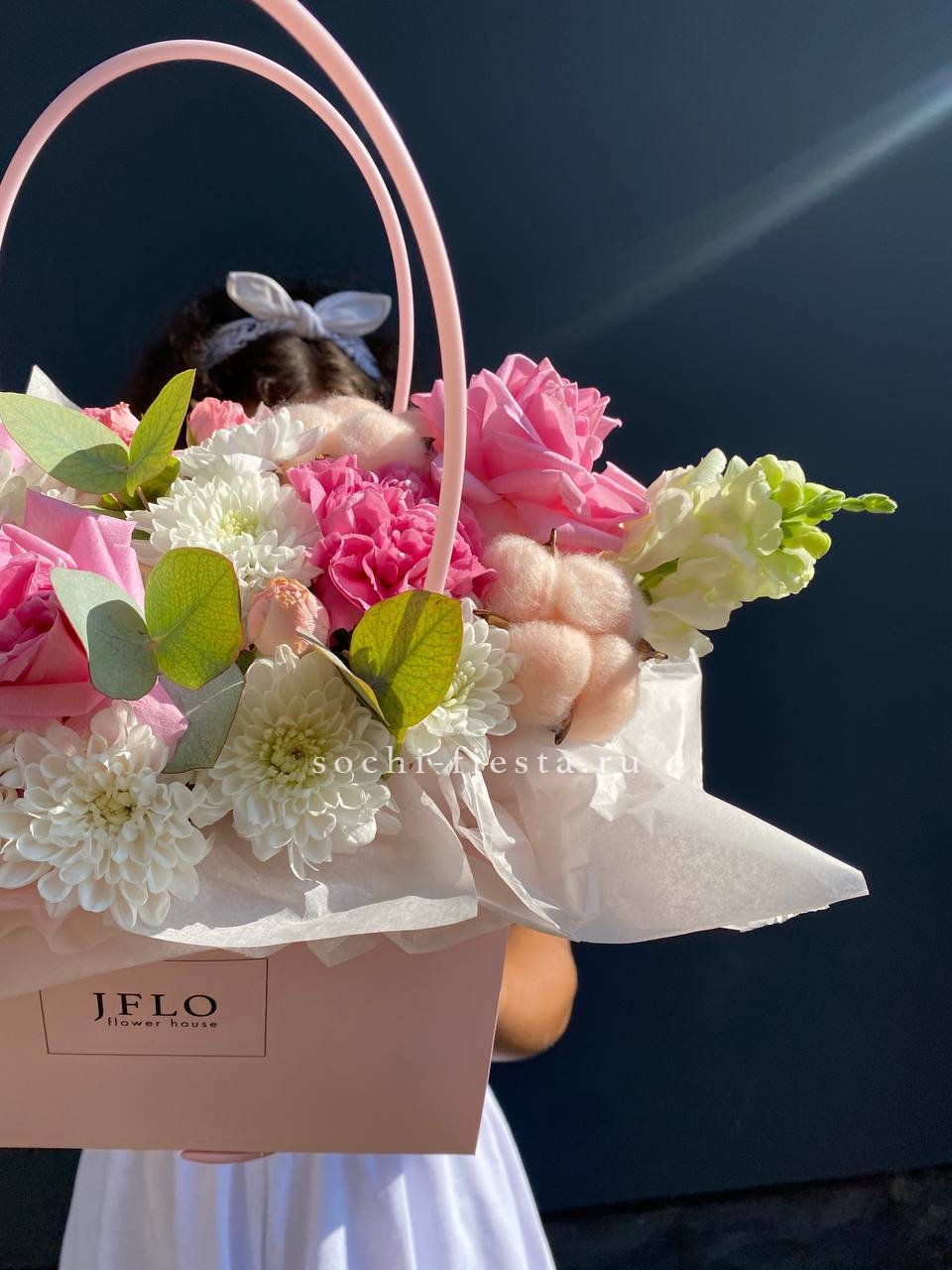 гортензия, розы, эустома, эвкалипт, диантус, лента, сумка.