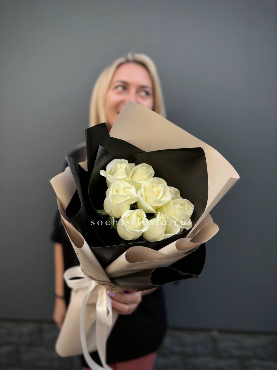 7 белых роз, дизайнерская упаковка. Данная цена доступна при единовременном заказе от 10 шт.