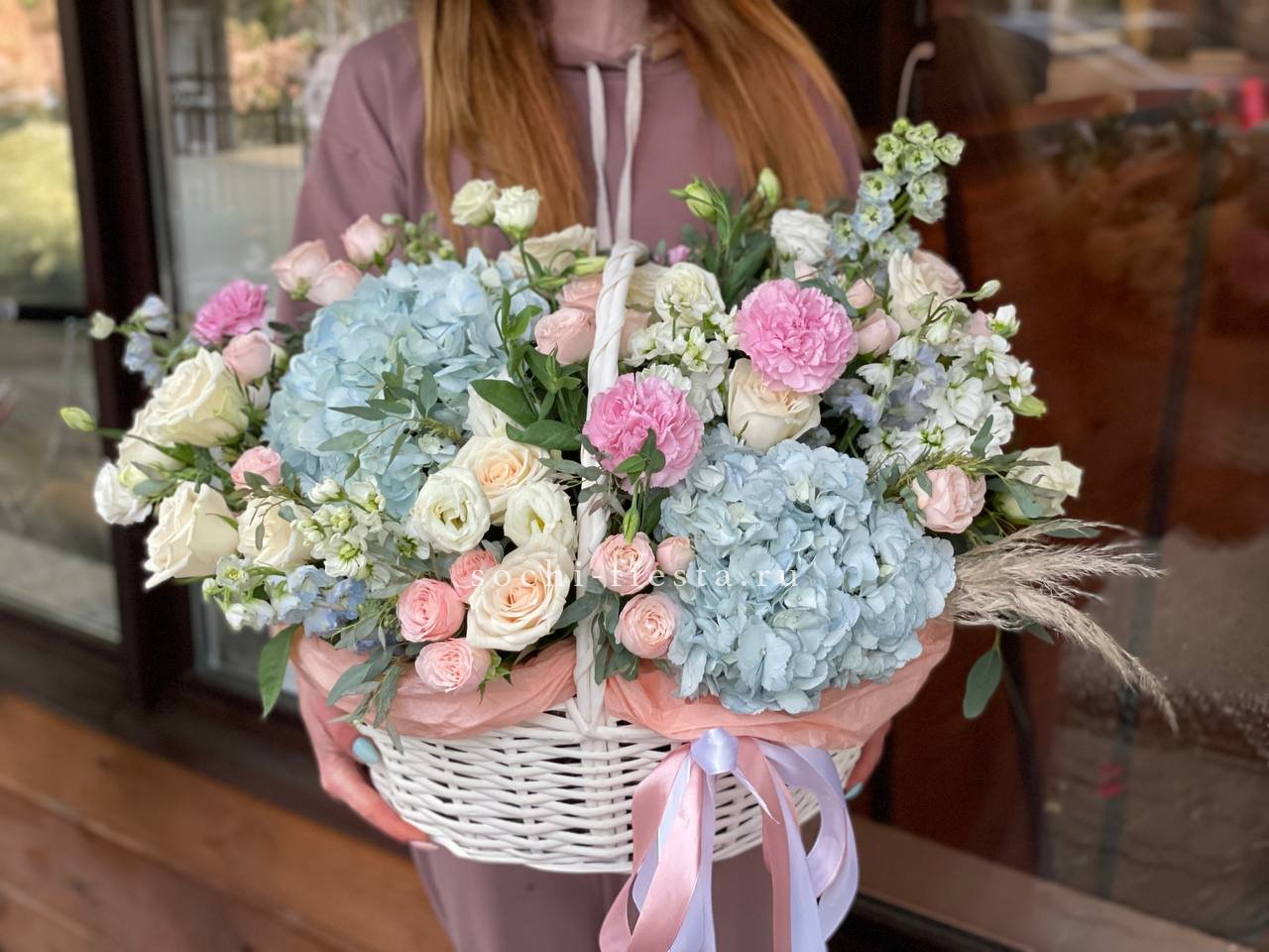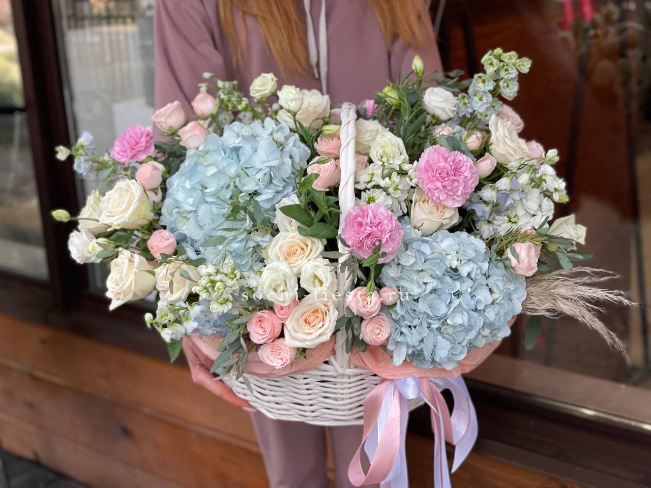 гортензия нежно-розовых оттенков, эустома, лилии, диантус, кустовая роза, эвкалипт, вспомогательная зелень, лента, светлая корзина.