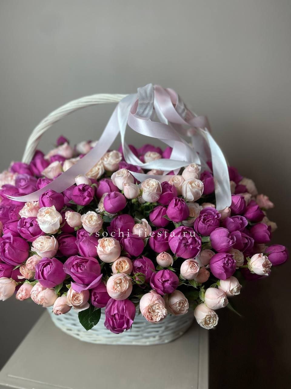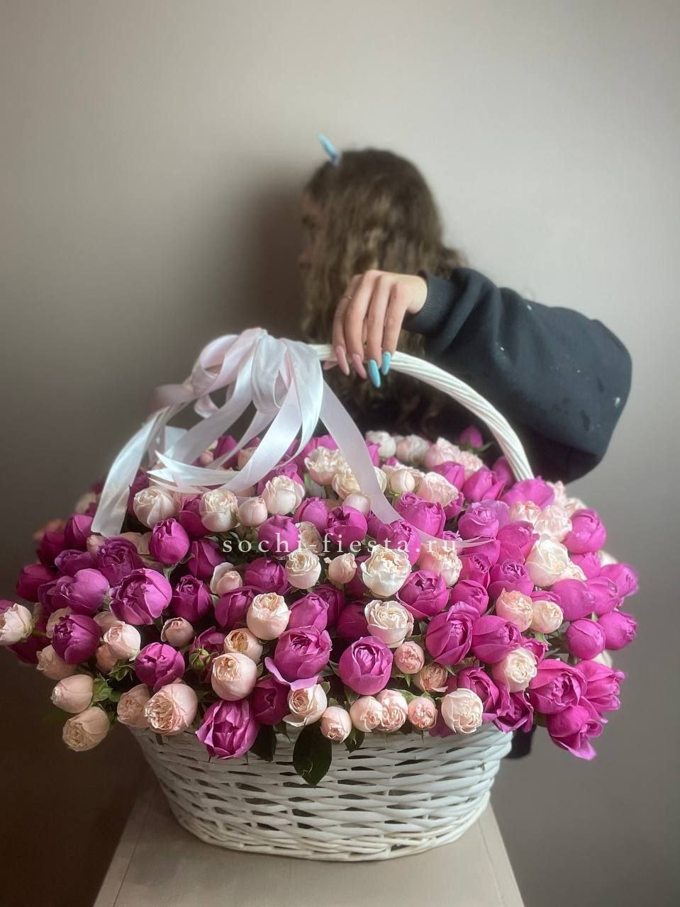 розы, эустома, гортензия, бомбастик, маттиола ( или аналог), эвкалипт, корзина.