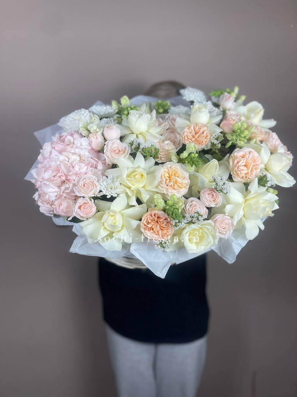 Плетёная корзина вмещает густую композицию из белых и розовых бутонов. Хризантемы и розы перемежаются с соцветиями гортензии, а статица добавляет воздушности между крупными головками цветов.