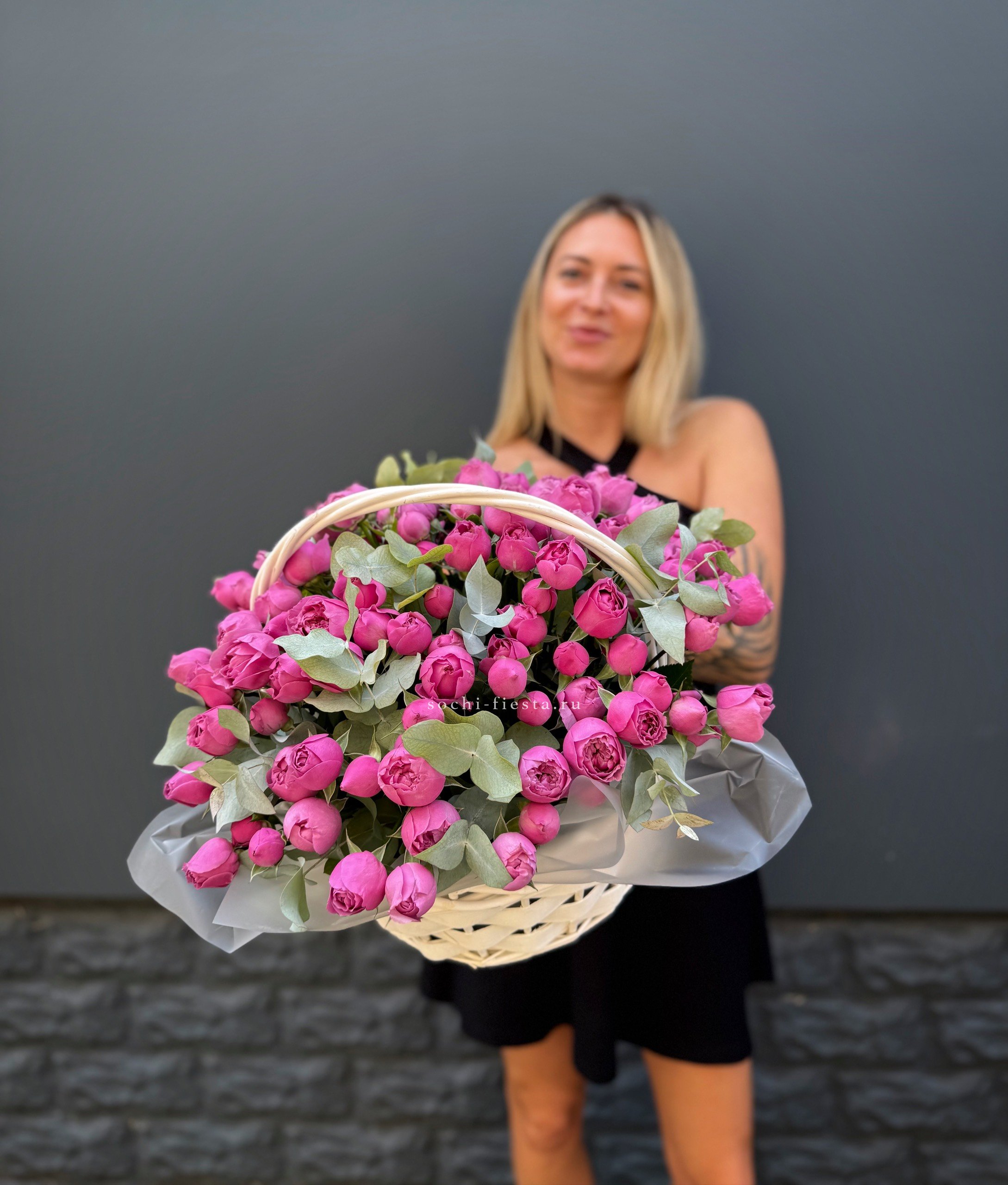 Сорок одна пионовидная роза в светлой корзине выстраивает объёмную композицию с мягкими переливами лилового и розового. Эвкалипт обрамляет густую россыпь бутонов.