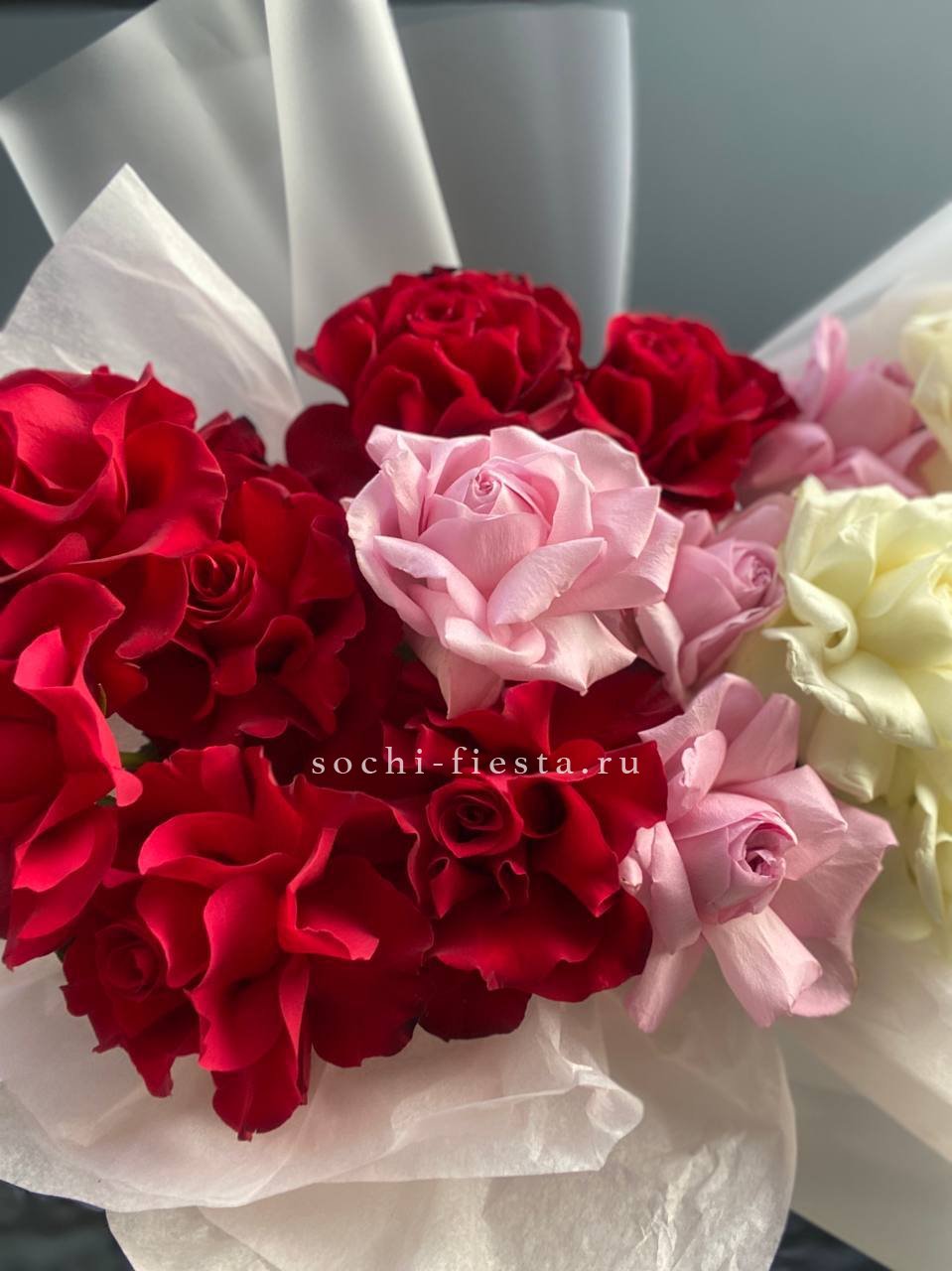Семнадцать роз в трехцветной гамме: белые, розовые и красные бутоны чередуются свободно. Переходы оттенков создают живую динамику без четких границ.