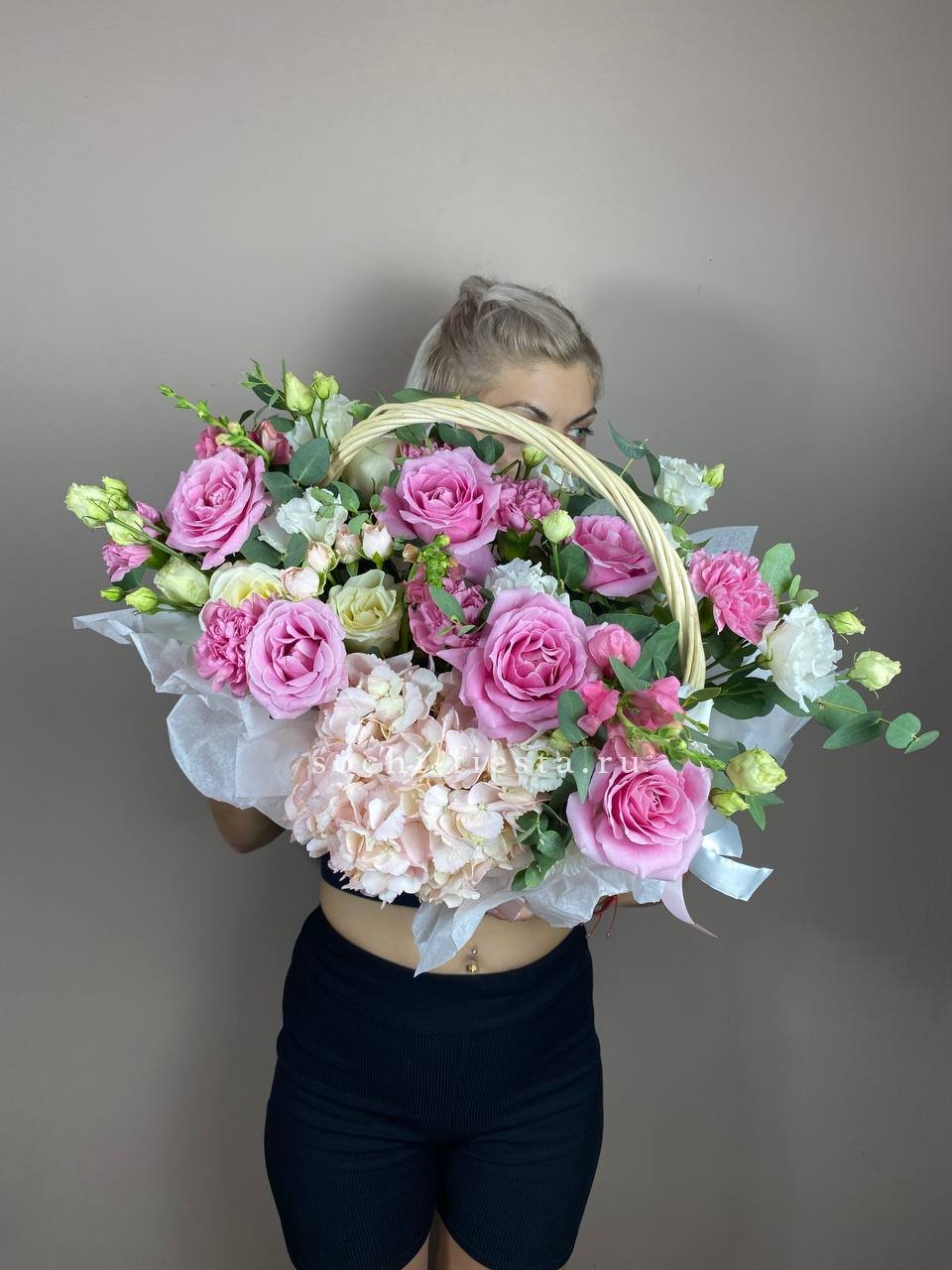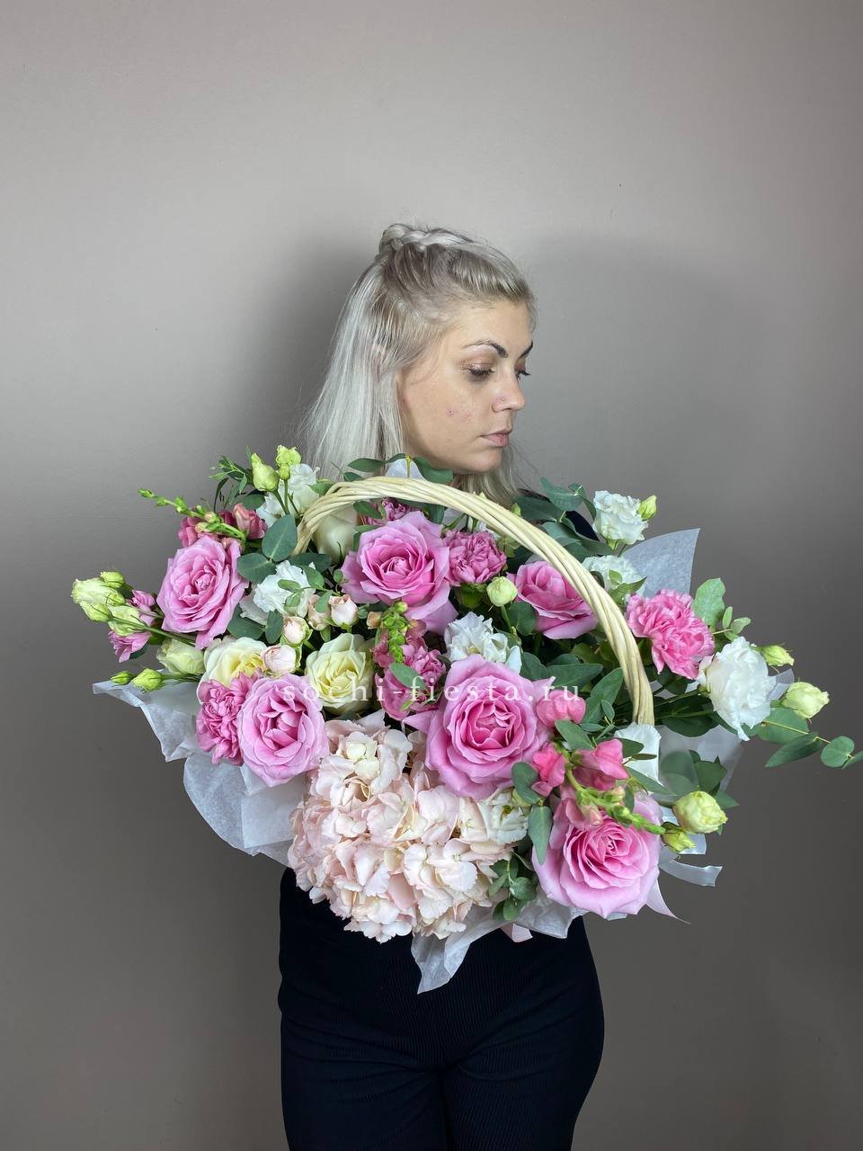 Пятьдесят один бутон Мисти Баблс собраны в плетёную корзину и образуют плотную цветущую полусферу. Лавандовые оттенки раскрываются постепенно и держат форму долго.