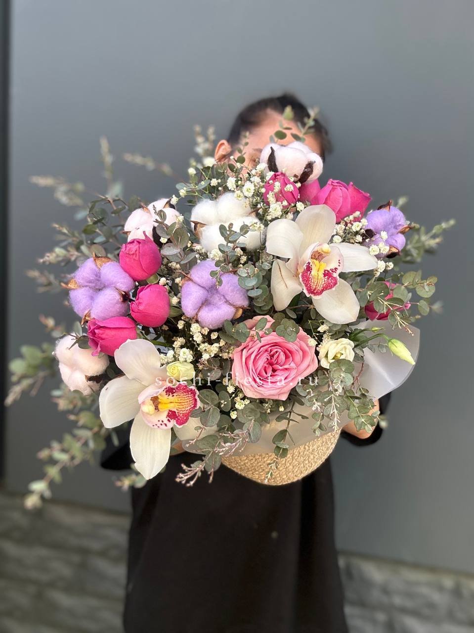 орхидеи, розовые розы, эвкалипт, гипсофила, джут кашпо.